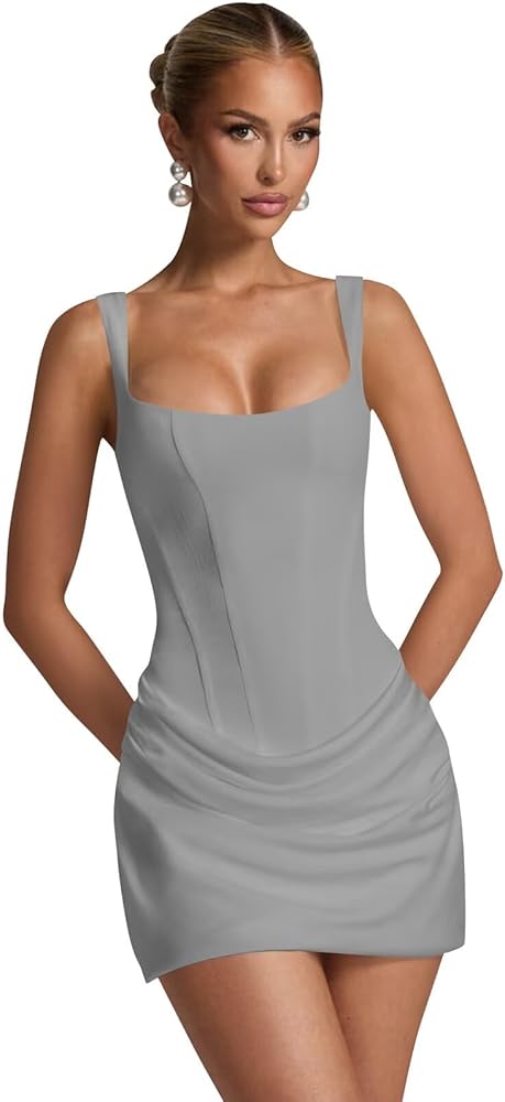 تصميم فريد: ساتان، خط عنق مربع، رقبة متدلية، أشرطة مدببة، طول قصير، طيات عميقة، رباط من الخلف، خصر منسدل، ضيق