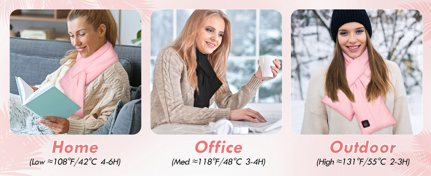 🔥【عمر بطارية يدوم طوال اليوم وتخصيص 3 درجات حرارة】يعمل هذا الوشاح ببطارية قابلة لإعادة الشحن عالية السعة تبلغ 1800 مللي أمبير في الساعة، ويوفر ما يصل إلى 12 ساعة من الدفء المستمر بشحنة واحدة. يمكنك التبديل بسهولة بين ثلاثة إعدادات لدرجة الحرارة (عالية ≈131 درجة فهرنهايت/55 درجة مئوية/متوسطة ≈118 درجة فهرنهايت/48 درجة مئوية/منخفضة ≈108 درجة فهرنهايت/42 درجة مئوية) بضغطة زر بسيطة، حتى تتمكن من تخصيص راحتك في أي طقس.