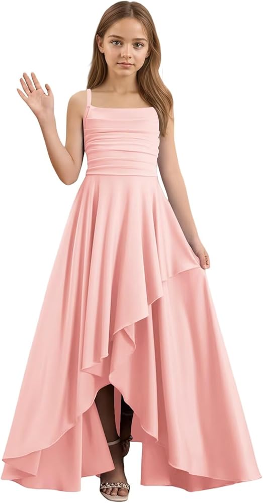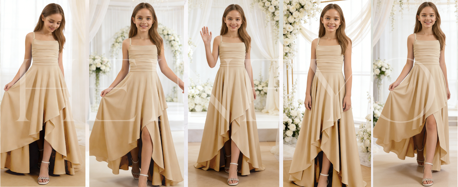 • تصميم فريد: أحزمة سباغيتي رقيقة وطيات أمامية تضفي رقيًا بسيطًا، وتبرز خط الرقبة بشكل مثالي؛ تخلق الحاشية غير المتماثلة تأثيرًا رشيقًا ومتدفقًا مع كل خطوة، مما يعزز سحر أميرتك الصغيرة المرحة.
