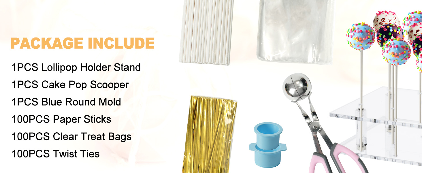 【محتويات العلبة】تشتمل مجموعة حامل الكيك الكل في واحد على حامل أكريليك مكون من 22 فتحة، وقالب دائري للكيك، ومغرفة للكيك، و100 قطعة من أعواد الكيك، و100 قطعة من ربطات العنق الملفوفة، و100 قطعة من أكياس الحلوى الشفافة - كل ما تحتاجه لصنع وتزيين وعرض مصاصات الكيك أو المصاصات في مجموعة واحدة بأسعار معقولة