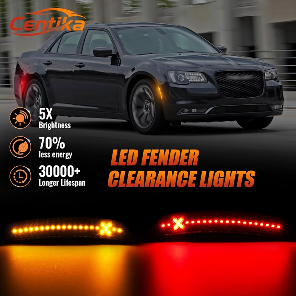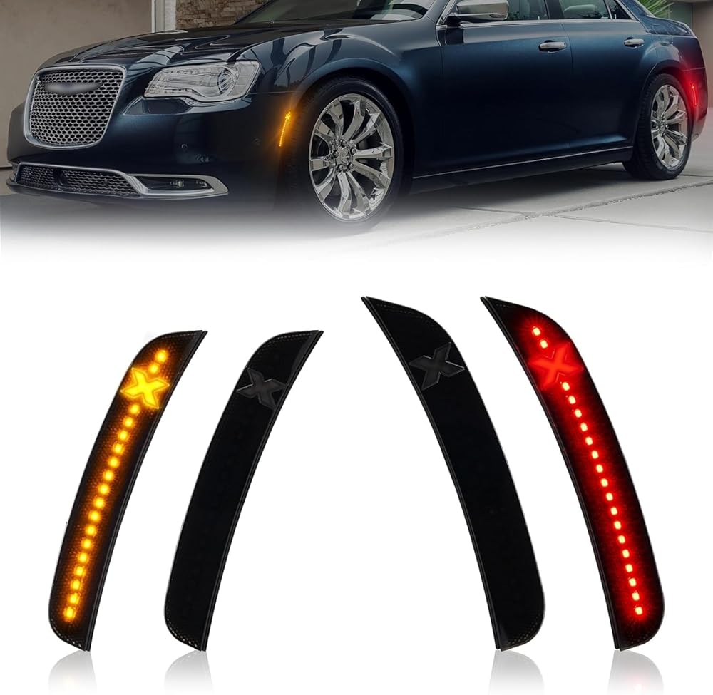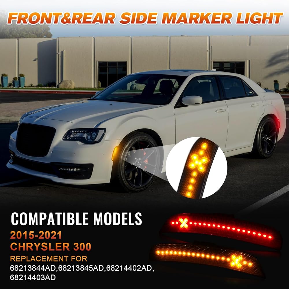 إضاءة أكثر سطوعًا ومزدوجة الألوان بنسبة 500% - يتميز ضوء التحديد الجانبي LED على شكل X بإضاءة كهرمانية وحمراء لتعزيز الرؤية، مدعوم بمصابيح SMD LED عالية الطاقة 18 مرة، ويوفر إخراج أكثر سطوعًا 5 مرات من مصابيح المصنع الخافتة - مما يضمن تميز كرايسلر 300 ليلاً ونهارًا.