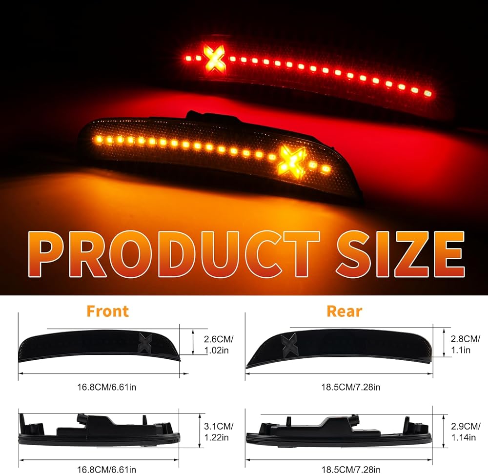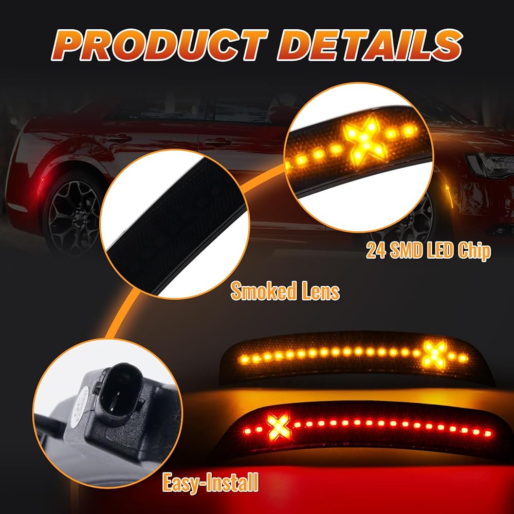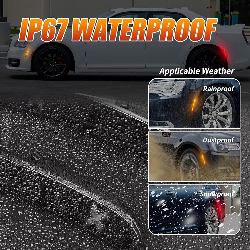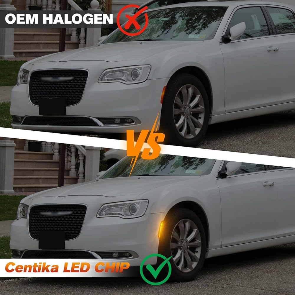 إضاءة أكثر سطوعًا ومزدوجة الألوان بنسبة 500% - يتميز ضوء التحديد الجانبي LED على شكل X بإضاءة كهرمانية وحمراء لتعزيز الرؤية، مدعوم بمصابيح SMD LED عالية الطاقة 18 مرة، ويوفر إخراج أكثر سطوعًا 5 مرات من مصابيح المصنع الخافتة - مما يضمن تميز كرايسلر 300 ليلاً ونهارًا.