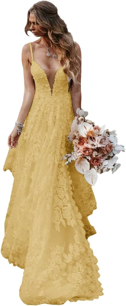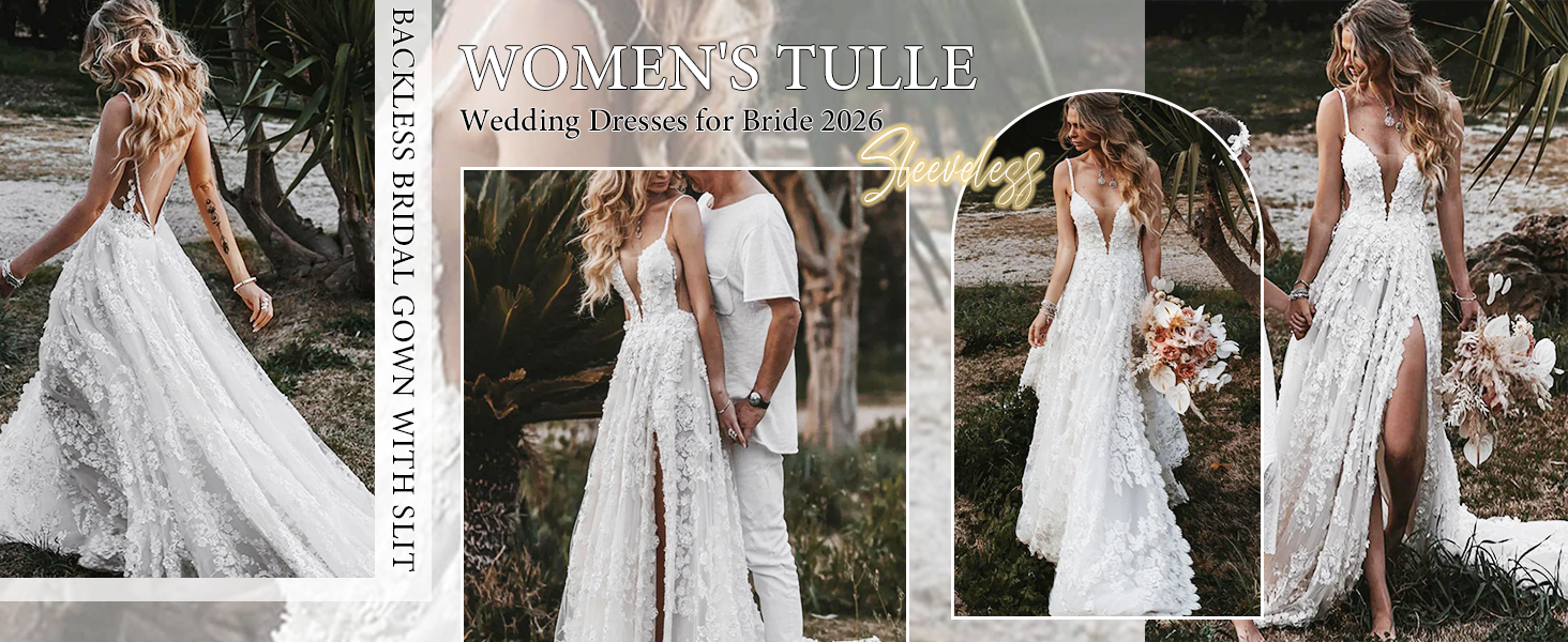 Designs: This is a gorgeous Wedding Dress with spaghetti straps and a deep V neck design, which is both modern and elegant. The upper body is decorated with exquisite Lace Applique, adding a touch of luxury. The side is made of see through tulle fabric, featuring laces patterns of the same color, which is unique and graceful.and the trailing design adds an air of presence. It is suitable for formal occasions such as banquets and balls
