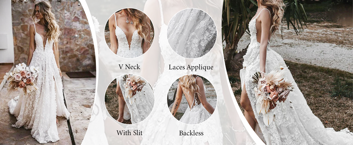 This series of formal gowns is not restricted by seasons or occasions. Suitable for your wedding party, wedding ceremony, wedding banquet, engagement party, bridal gift party, rehearsal dinner, destination wedding. Whether you hold your wedding in a church, garden, beach, hall or town hall, the V-neck lace appliqued Bohemian bride's dress, the simple beach long dress for spring, summer, autumn and winter, this dress will shine in every formal occasion.