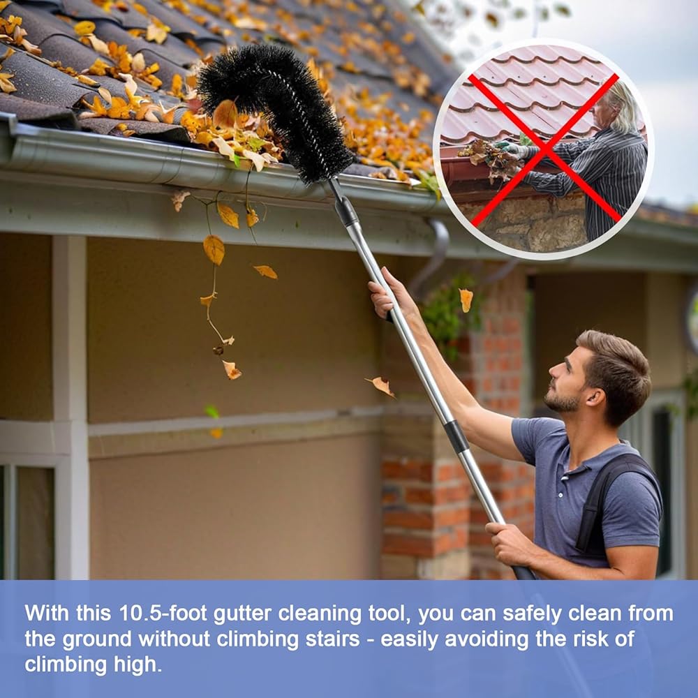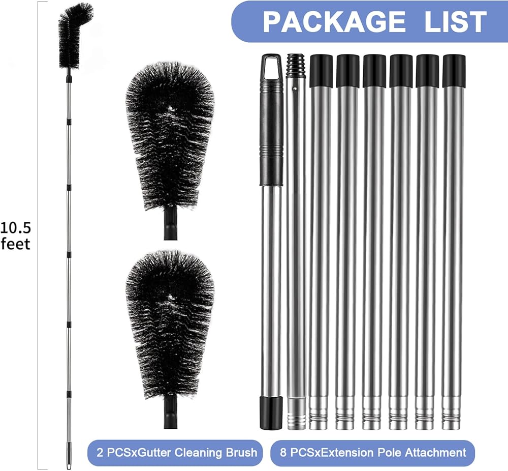 أدوات تنظيف الميزاب من الأرض - بطول 10.5 قدم مع 8 أعمدة وفرشتين، لا حاجة إلى سلم | أوراق سهلة التنظيف وحطام الأكواخ ومزاريب أسطح المنازل ومياه الصرف الصحي