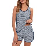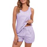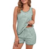 السمات: ملابس مريحة مكونة من قطعتين تتميز بقميص بدون أكمام برقبة واسعة، وسروال قصير مع جيبين جانبيين، وحزام خصر برباط، ونمط مخطط وحاشية منحنية، مقاس عادي. توفر مجموعة البيجامة المريحة هذه تجربة ارتداء ناعمة ومريحة ليلاً