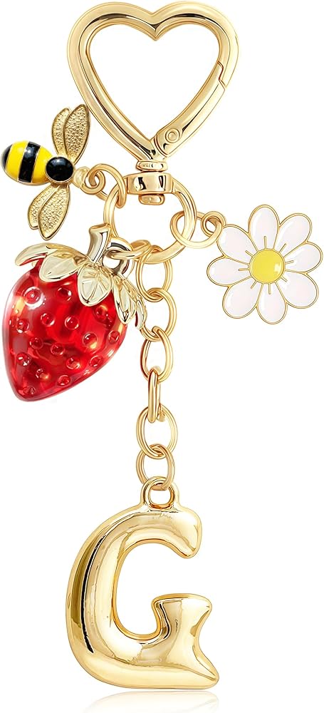 Playful Strawberry & Bee Design: Add a touch of nature's sweetness to your style! This unique gold bubble initial keychain features a vibrant 3D red strawberry adorned with sparkling rhinestones, a tiny honey bee, and a delicate white daisy flower. It's the perfect blend of playful charm and elegant floral aesthetics for any fruit lover