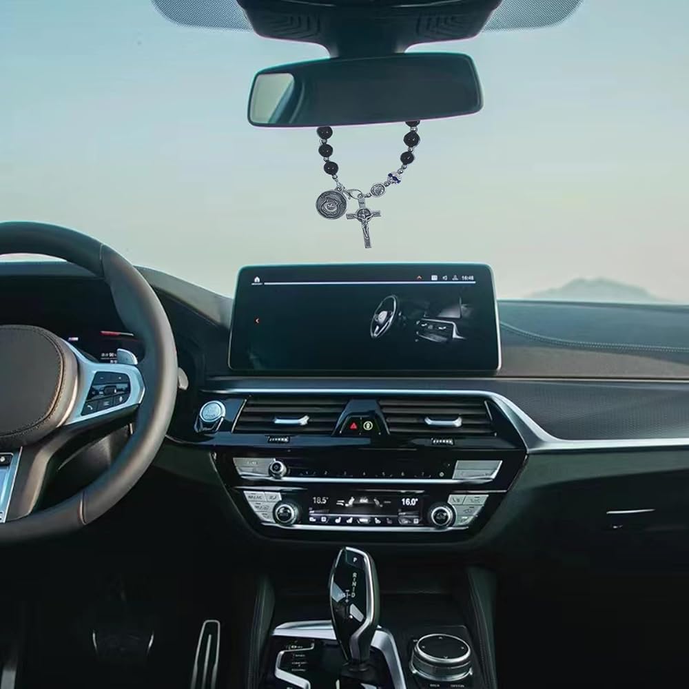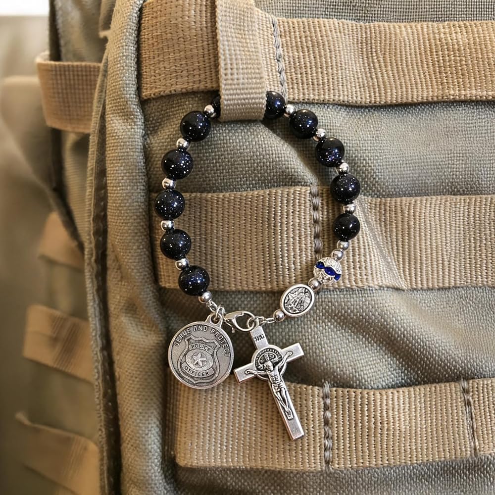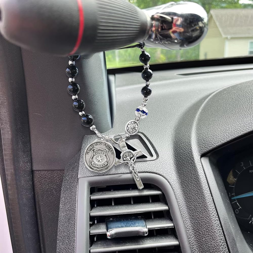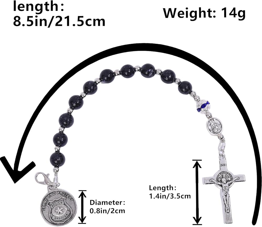 مسبحة جيب الشرطة من سانت مايكل - سبحة صلاة من الحجر الرملي الأزرق مع شارة سحرية - هدايا تخرج لإنفاذ القانون للشرطي والشريف (زينة مرآة الرؤية الخلفية للسيارة وبطاقة مباركة)