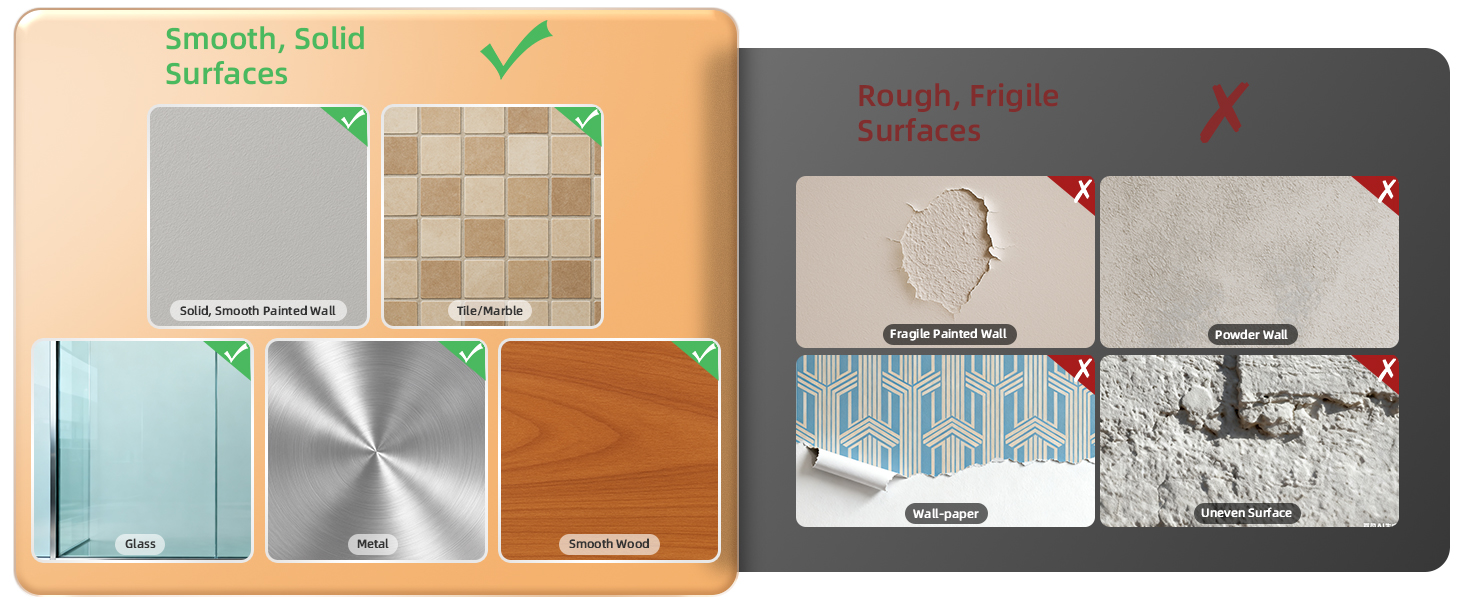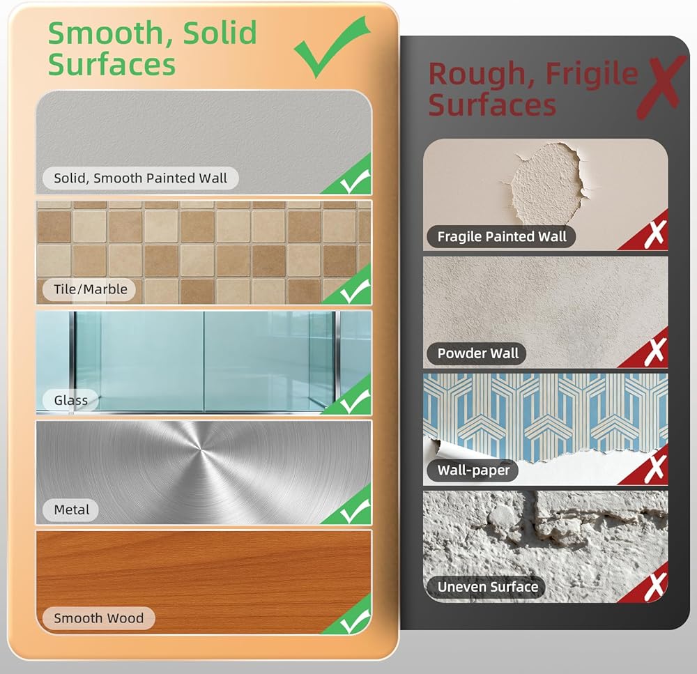 ✅【يعمل على معظم الأسطح الملساء】- مثالي للجدران المطلية والخشب النهائي والزجاج والبلاط والمعادن والبلاستيك. لا يُنصح باستخدامه مع ورق الحائط أو الأسطح الخشنة أو البودرة - تأكد من أن حائطك نظيف وجاف وصلب قبل وضعه.