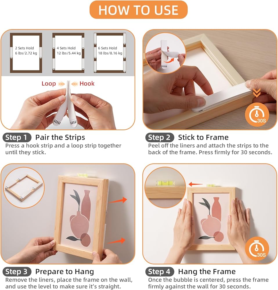 ✅【تركيب خالٍ من الأظافر، بدون أدوات】- ما عليك سوى التقشير واللصق والضغط - بدون حفر أو مطارق أو إجهاد. تأتي كل مجموعة مع أداة مستوى لمساعدتك في الحفاظ على إطاراتك مستقيمة تمامًا، ودليل مستخدم مفصل للتثبيت السهل خطوة بخطوة.