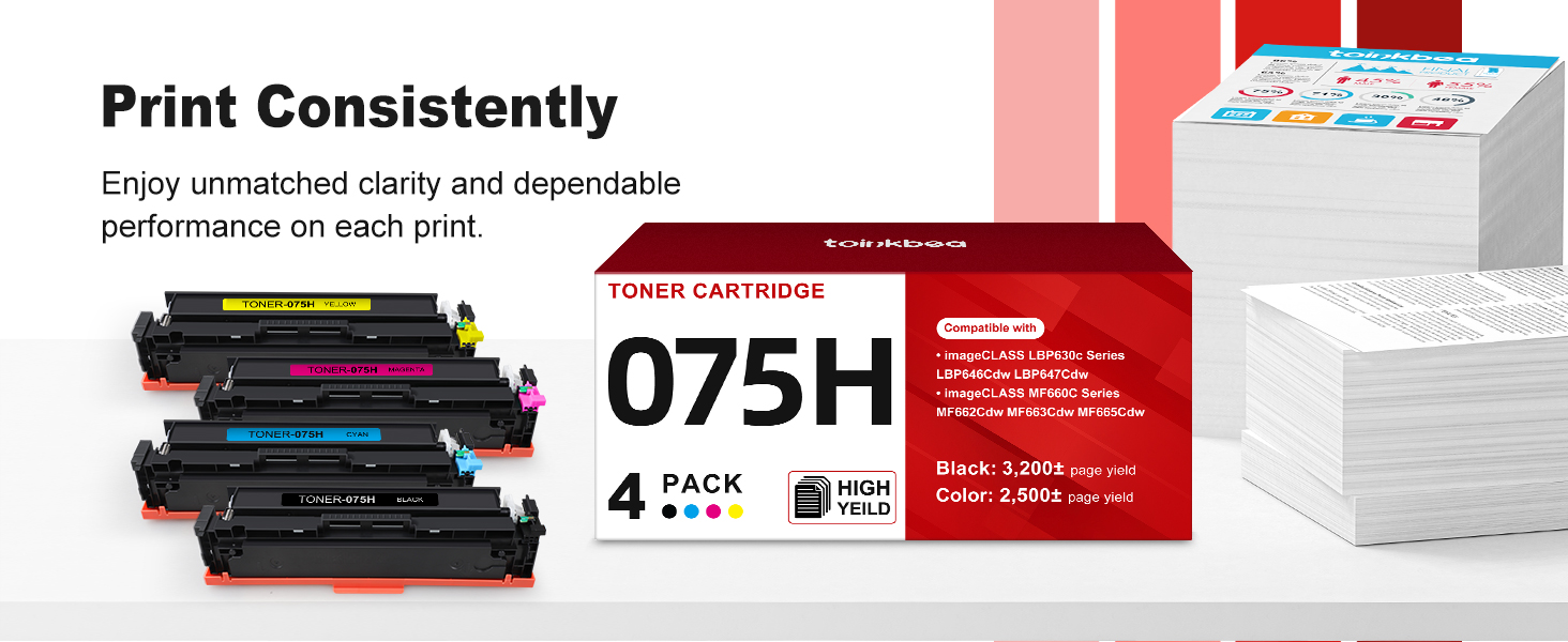 Printer Compatibility: toinkbea 075H 075 High Capacity Toner Cartridge replacement for Canon 075H Toner Cartridge Set, designed to work seamlessly with Canon imageCLASS LBP640 LBP640C LBP646Cdw LBP647Cdw MF660 MF660C MF662Cdw MF663Cdw MF665Cdw Series Printer.