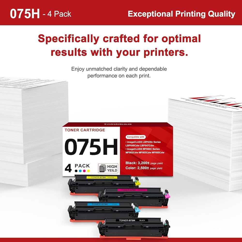 Package Includes 4-Pack 075H toner cartridges: 075 H Black (6369C001), 075 H Cyan (6368C001), 075 H Yellow (6366C001), 075 H Magenta (6367C001). Convenient full set packaging makes replacement easier and printing more efficient.