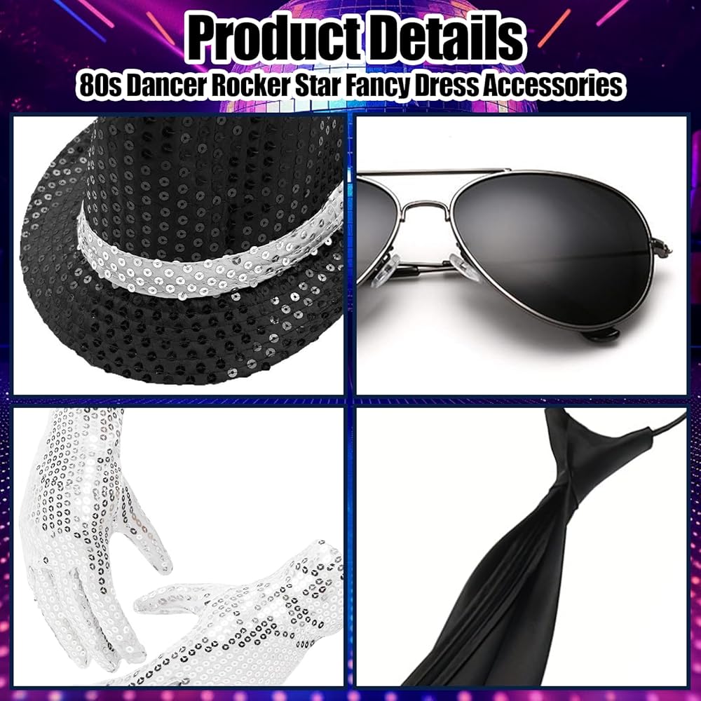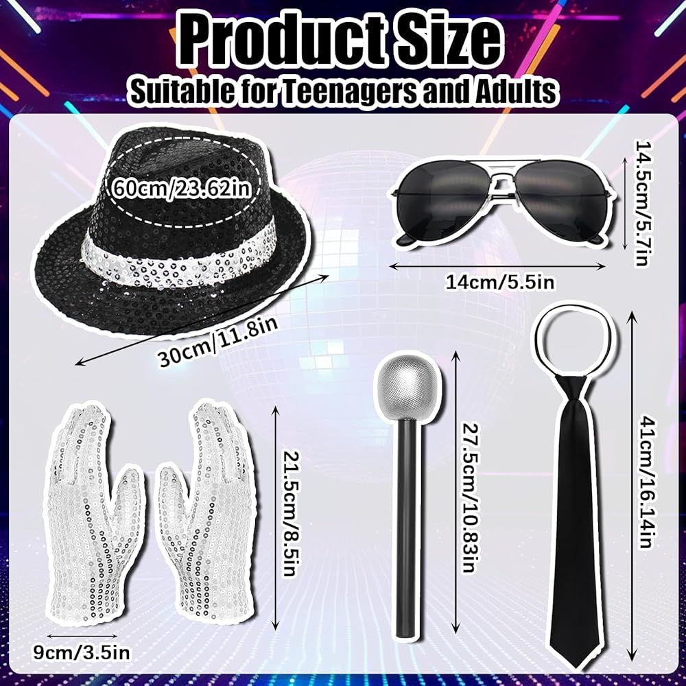 1. The pop music superstar costume accessories set is made of high quality nylon and plastic. The fabric is comfortable, soft and elastic. It includes a jazz sequin hat, shiny gloves, a microphone, a black tie and a pair of fashionable sunglasses, which can be used many times.