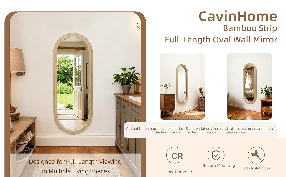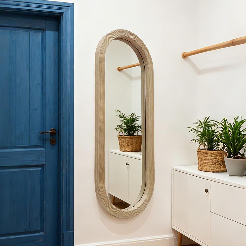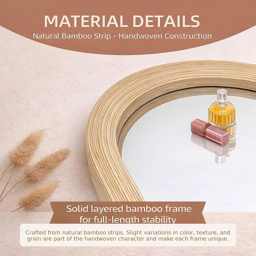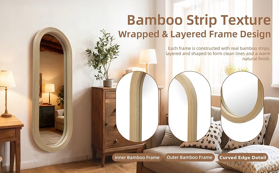 𝐋𝐚𝐲𝐞𝐫𝐞𝐝 𝐁𝐚𝐦𝐛𝐨𝐨 𝐂𝐫𝐚𝐟𝐭𝐬𝐦𝐚𝐧𝐬𝐡𝐢𝐩 مرآة الحائط كاملة الطول مصنوعة من شرائح الخيزران الحقيقية ومبنية بإطار كبير مقاس 2 بوصة، مما يخلق عمقًا خطيًا نظيفًا وحضورًا واثقًا على الحائط. يعزز الهيكل متعدد الطبقات المتانة مع الحفاظ على لمسة نهائية طبيعية مصقولة.