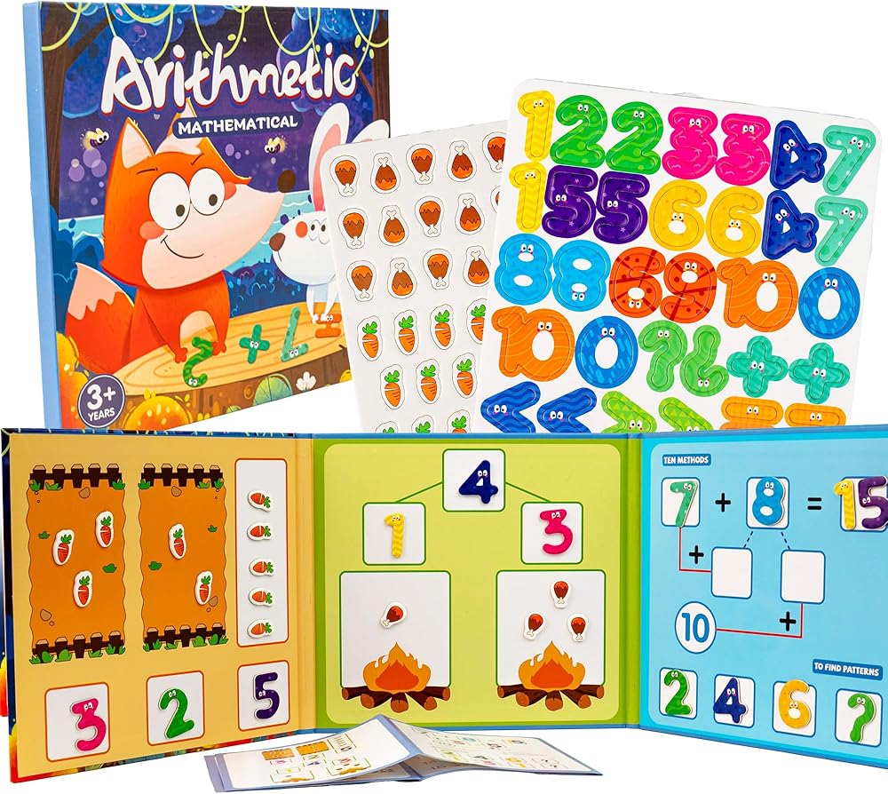 مجموعة تعلم الرياضيات الكل في واحد مكونة من 96 قطعة: تتضمن مجموعة الرياضيات التفاعلية هذه 22 رقمًا مغناطيسيًا، و12 رمز تشغيل، و60 مغناطيسًا ممتعًا للعد (الجزر وأرجل الدجاج)، وكتاب حسابي ثلاثي الطيات، ودليل. توفر القطع الـ 96 مجموعة أدوات كاملة لإتقان الأرقام والرياضيات الأساسية