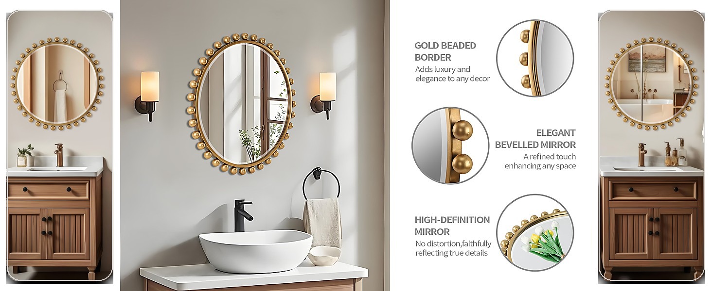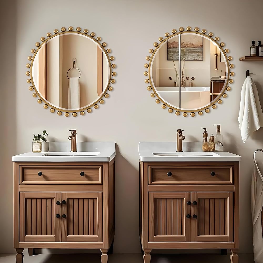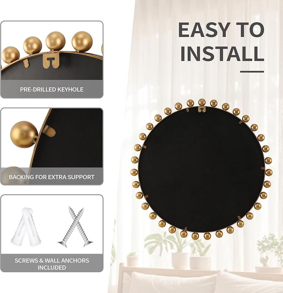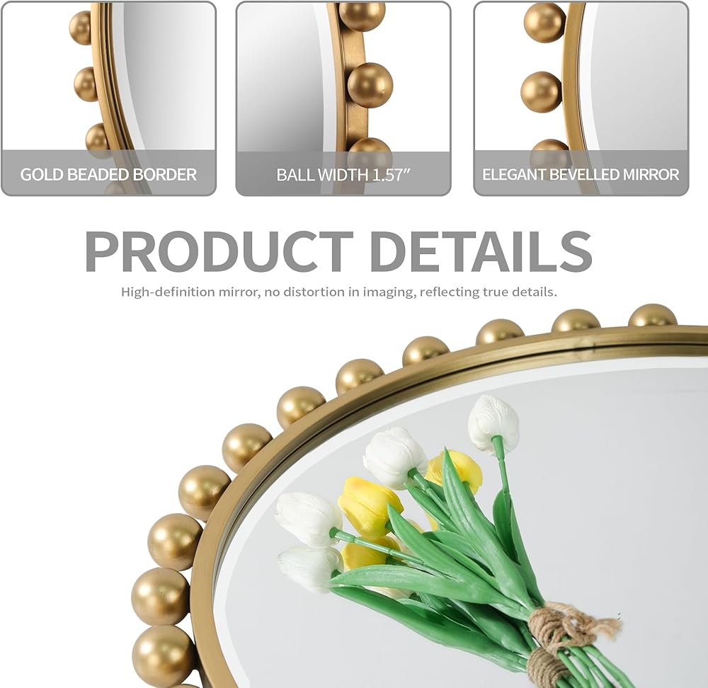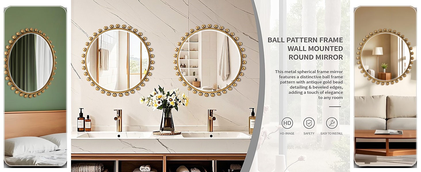 𝐃𝐞𝐜𝐨𝐫𝐚𝐭𝐢𝐯𝐞 𝐑𝐨𝐮𝐧𝐝 𝐖𝐚𝐥𝐥 𝐌𝐢𝐫𝐫𝐨𝐫 𝐰𝐢𝐭𝐡 𝐀𝐧𝐭𝐢𝐪𝐮𝐞 𝐆𝐨𝐥𝐝 𝐌𝐞𝐭𝐚𝐥 𝐁𝐚𝐥𝐥 𝐅𝐫𝐚𝐦𝐞: مصممة كمرآة عملية مثبتة على الحائط للمداخل وغرف المعيشة وغرف النوم والممرات. تتميز مرآة الحائط المستديرة هذه بسطح زجاجي عاكس شفاف وإطار معدني ذهبي عتيق مستوحى من الطراز القديم، مما يوفر استخدامًا عمليًا للمرآة وجاذبية أنيقة لديكور الحائط.
