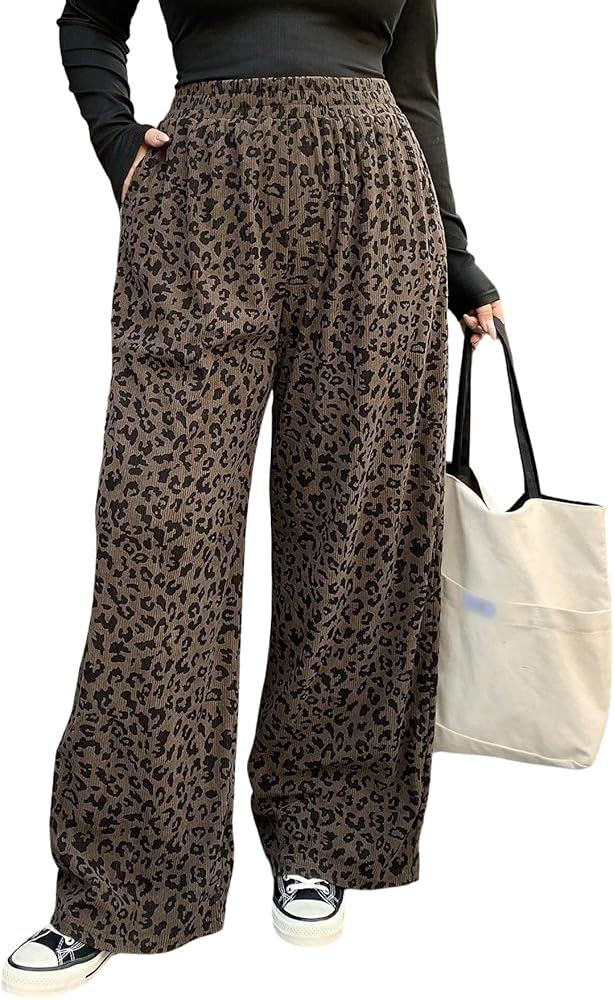 Women's Leopard Cheetah Corduroy Wide Leg Pants Elastic High Waisted Baggy Pants Casual Trousers in Kuwait