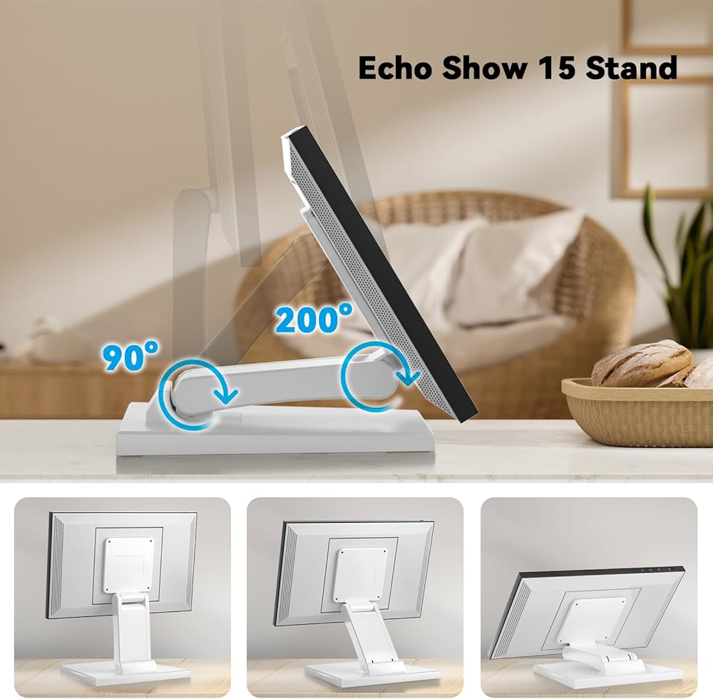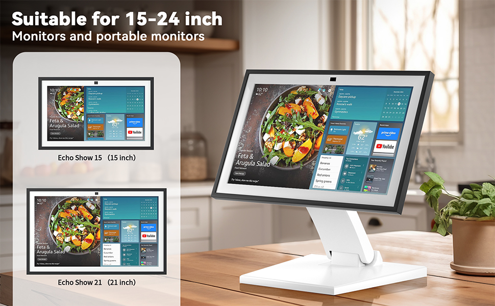 **سهل الاستخدام** - يعمل مع شاشات Echo Show مقاس 15 و12-24 بوصة. مثالي للمطبخ أو المكتب أو غرفة الطعام أو غرفة المعيشة. لا حاجة إلى الحفر أو المشابك - فقط ضعه على مكتبك. يتحرك بسهولة أينما تريد.