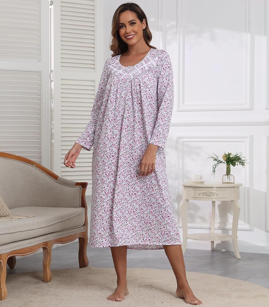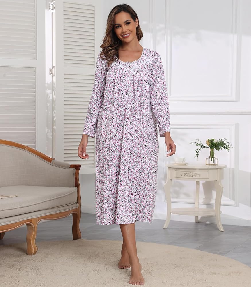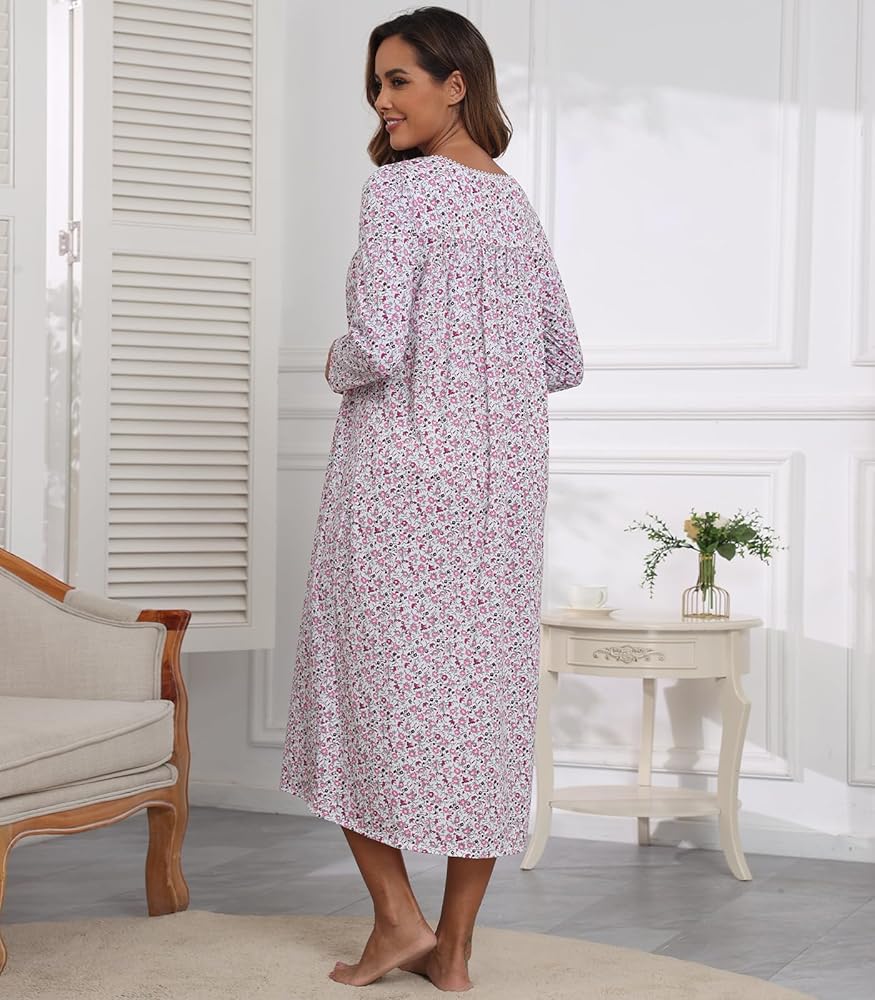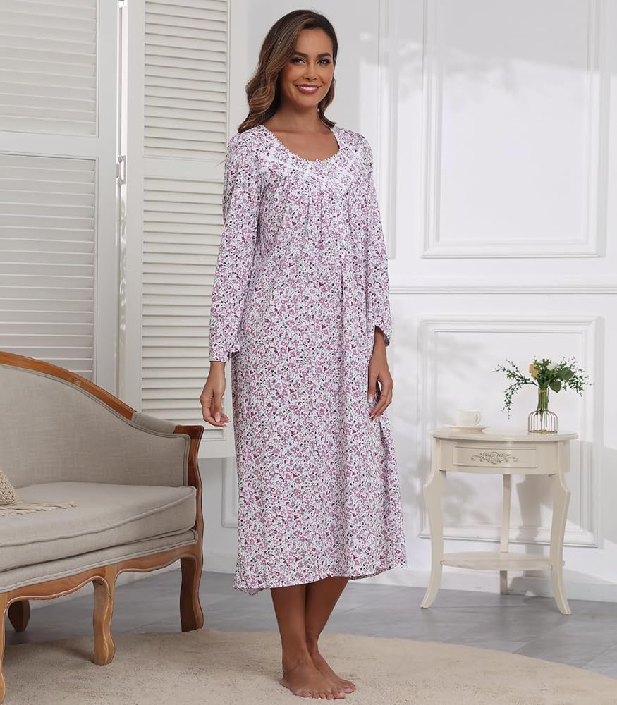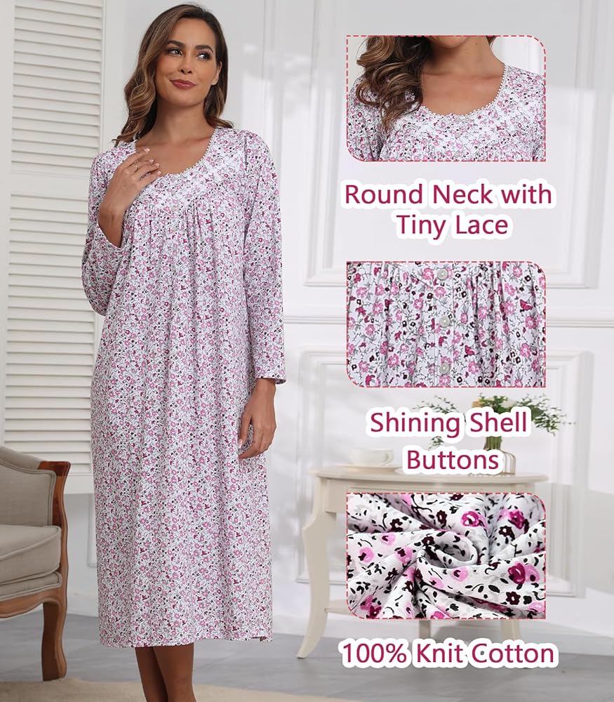 السمات: تتميز قمصان النوم القطنية بأكمام طويلة برقبة واسعة أنيقة مع زخرفة من الدانتيل الرقيق وأزرار صدفية سهلة الاستخدام. الطول الكامل يوفر تغطية بسيطة ولا يمكن رؤيته من خلاله، وليس ملتصقًا، وسهل الارتداء والخلع