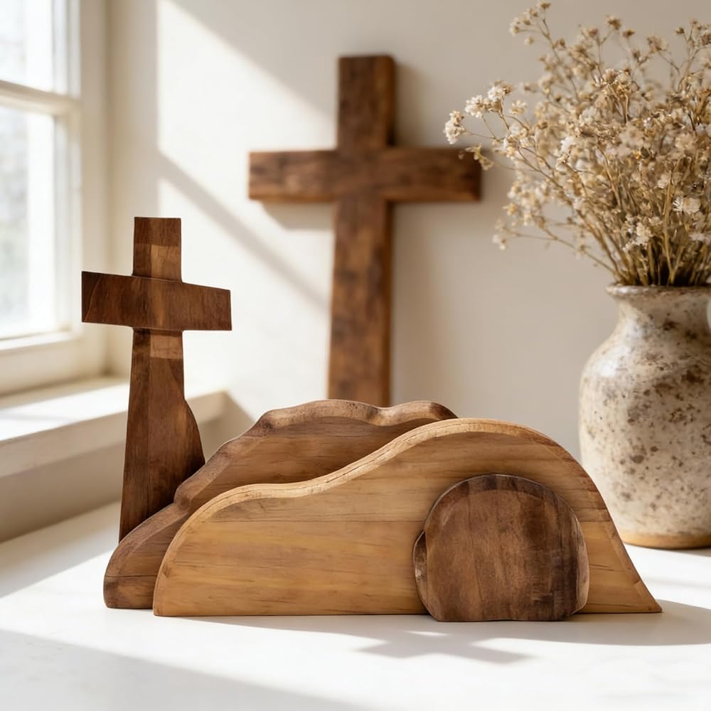 Designed for Easter decor this wooden cross & empty tomb tabletop decoration set is used to adorn tables shelves or mantels during Easter helping to create a sacred warm festive atmosphere with classic Resurrection-themed elements (cross empty tomb). Material: Made of durable wood material with smooth surface and fine craftsmanship suitable for long term display and repeated use.