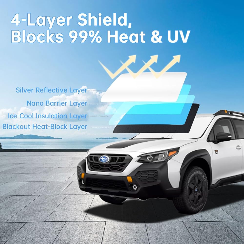 • 【قماش تبريد قوي❄️】مصنوع من نسيج واقي من الشمس مطور من 4 طبقات، تعكس إكسسوارات مظلة الشمس Subaru Outback ضوء الشمس وتمتص الحرارة - مما يحجب 99% من الحرارة والأشعة فوق البنفسجية. يخفض درجة الحرارة الداخلية لسيارتك بأكثر من 80 درجة فهرنهايت!