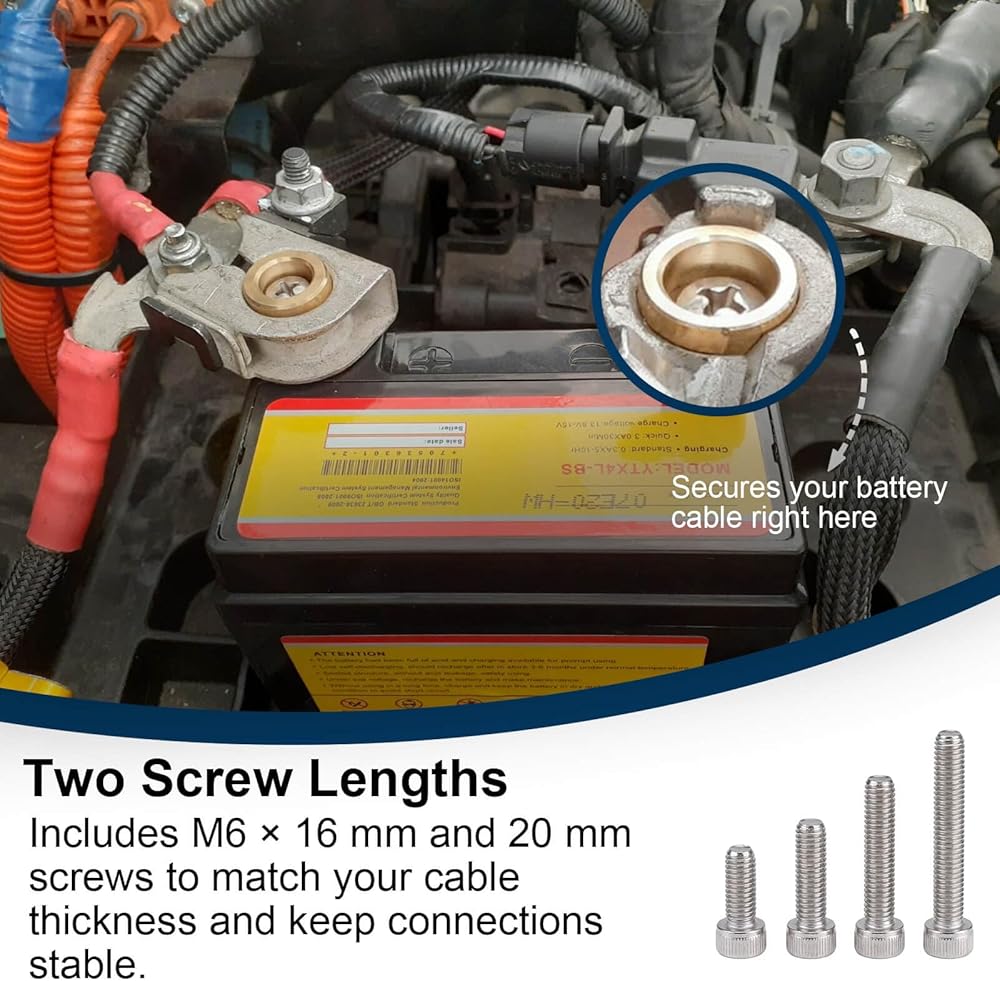 يتضمن طولين للبراغي: يتضمن براغي M6 × 16 مم وM6 × 20 مم من الفولاذ المقاوم للصدأ، مما يسمح لك باختيار الطول الصحيح بناءً على سمك الكابل واستخدام الغسالة، بدون تخمين، بدون خيوط مخططة.
