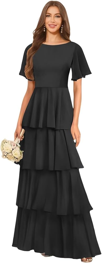 Style: Short sleeve bridesmaid dresses for women, tiered chiffon wedding guest dress with sleeves, layered long prom dress, chiffon maxi dress, cowl neck formal dress for wedding, a line mother dress, corset pageant dress, modest evening gown