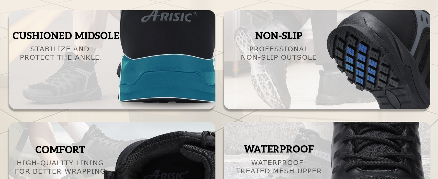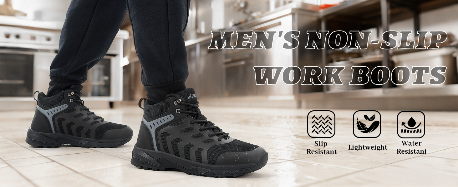 راحة ودعم طوال اليوم: تم تصميم هذه الأحذية المقاومة للانزلاق لتقليل التعب، وتوفر التوسيد ودعم الكاحل، مما يجعلها أحذية عمل مثالية للرجال أثناء التحولات الطويلة على أقدامهم.