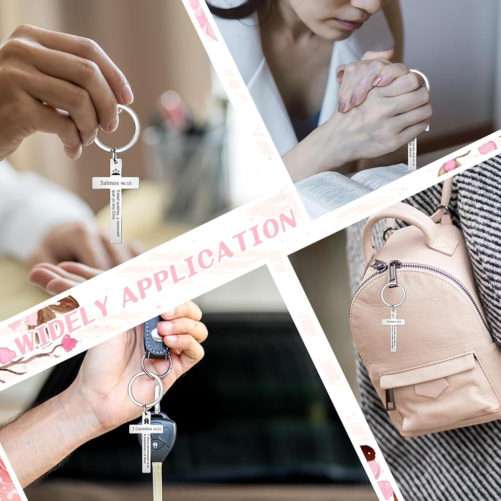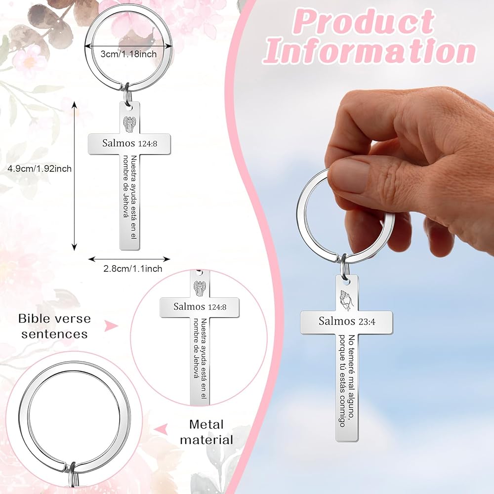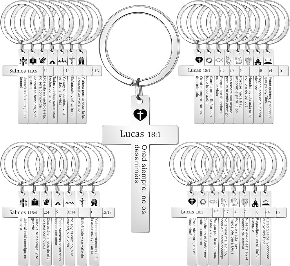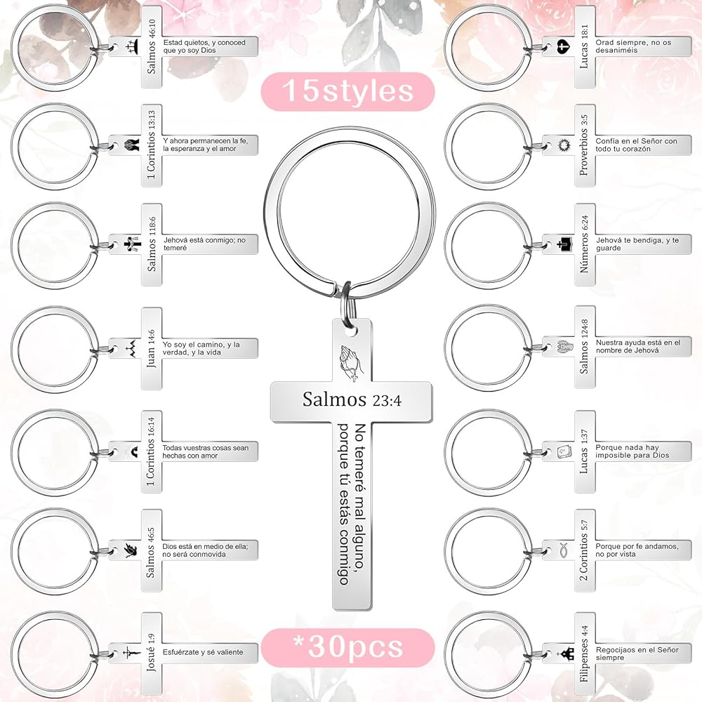 30Pcs Spanish Christian Keychain Bulk Set Christian Cross Keychain Bible Verse Keychain Stainless Steel Religious Inspirational Gifts Catholic Religious Gifts Easter Church Employee Favors