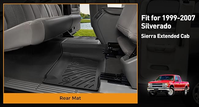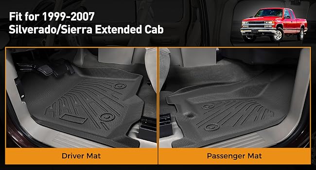 ملاءمة مخصصة لسيارة Chevy Silverado لـ GMC Sierra: تم تصميم سجادات أرضية الشاحنة هذه خصيصًا لشفروليه سيلفرادو وجي إم سي سييرا Extended Cab 1500 (2000-2005). غير متوافق مع موديلات Crew Cab. تشتمل المجموعة على سجادات أمامية وخلفية لتغطية كاملة. تتبع كل بطانة الخطوط الفريدة للجزء الداخلي لشاحنتك للحصول على مظهر سلس على طراز المصنع