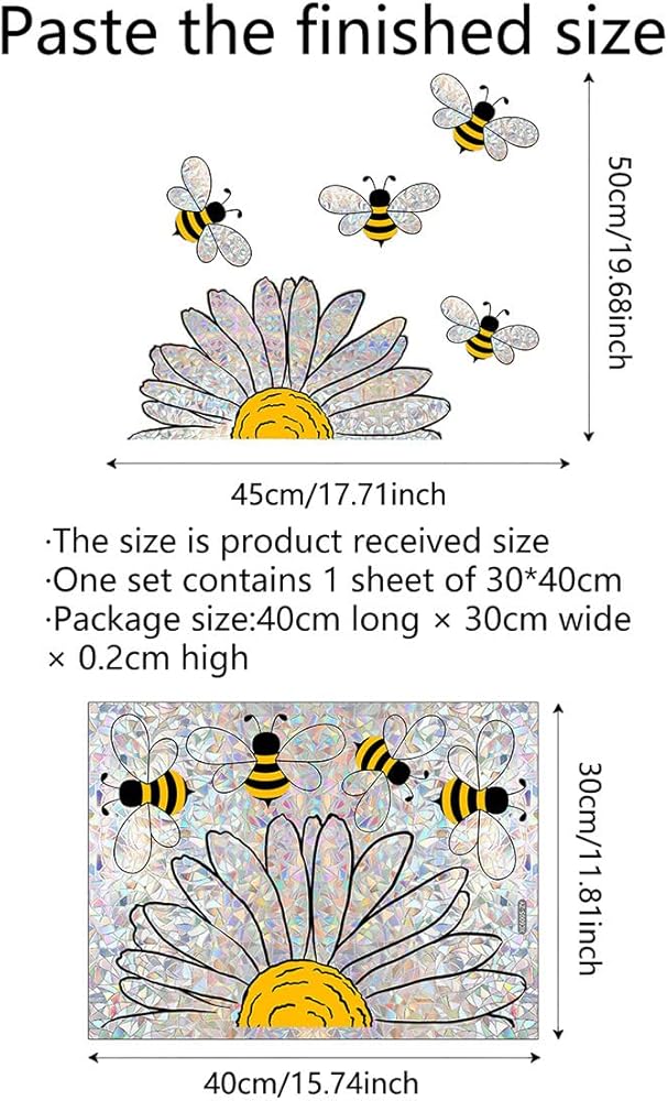 Transform your windows into a delightful summer scene with these charming holographic window clings featuring buzzing bees and a cheerful sunflower design. The double-sided decals create a stunning visual display from both inside and outside your home, with holographic elements that sparkle and shine when light hits them. Each set includes one sheet measuring 30x40cm (approximately 15.74x11.8 inches), which expands to a finished size of 45x50cm (17.71x19.68 inches) when arranged. The bees and sunflower pattern not only adds a decorative touch but also helps prevent bird strikes on glass windows. These easy-to-apply window stickers are reusable and require no adhesive - they cling naturally to clean glass surfaces. Perfect for brightening up any room while serving a practical purpose, these decorative clings bring a touch of nature's beauty to your living space. The holographic effect creates beautiful rainbow reflections when sunlight streams through, adding an extra dimension of visual interest to your windows.