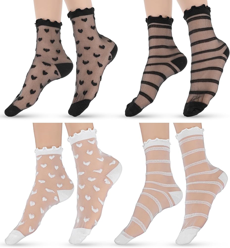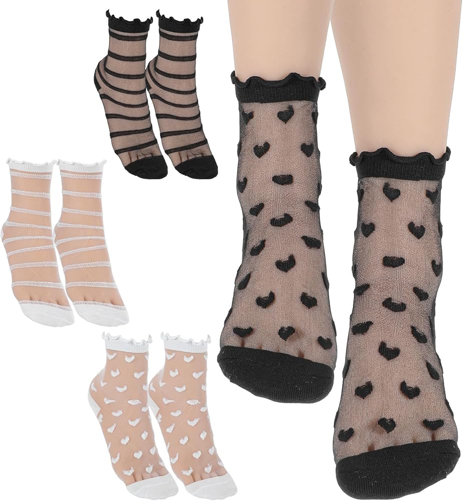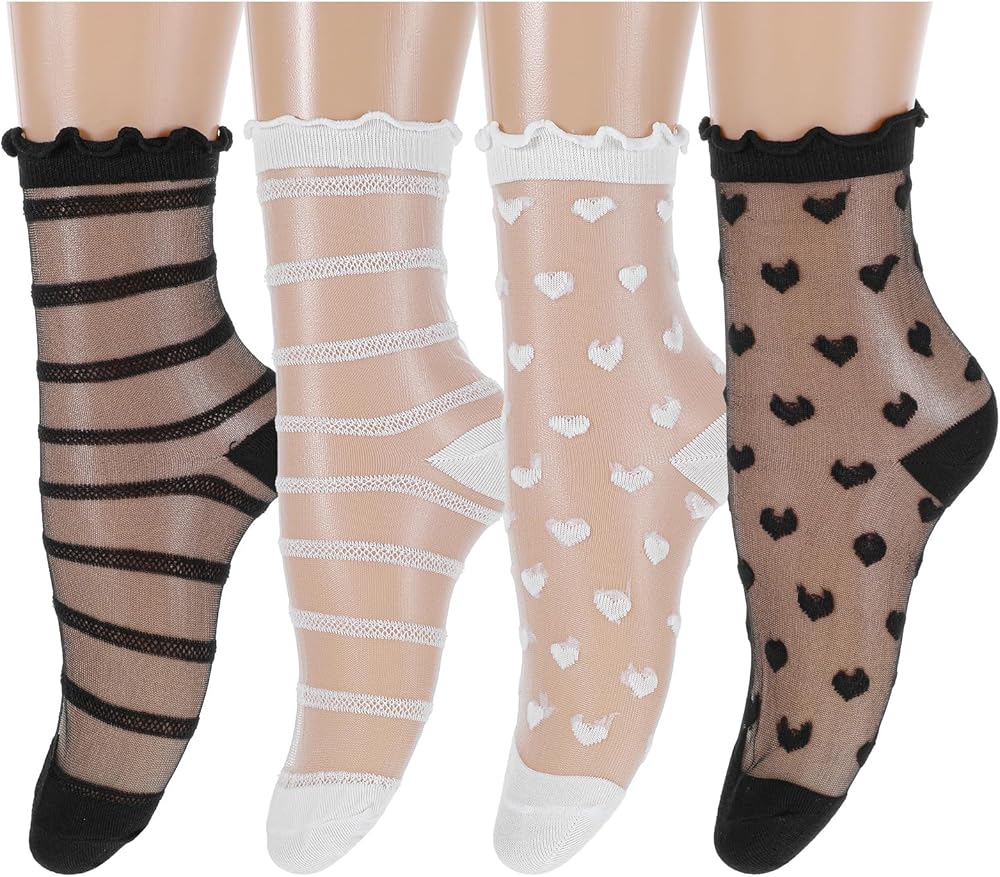 جوارب شفافة أنيقة - تتميز الجوارب النسائية المصنوعة من الدانتيل بأنماط شفافة مرحة مع فتحات مكشكشة رقيقة، مما يخلق مظهرًا أنيقًا مثاليًا للارتداء مع جوارب الكاحل الشفافة والصنادل الصيفية.