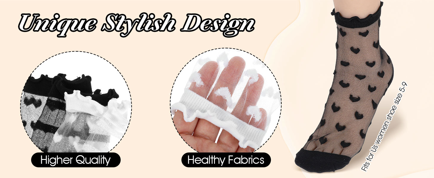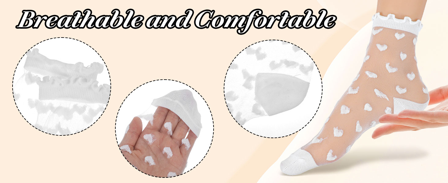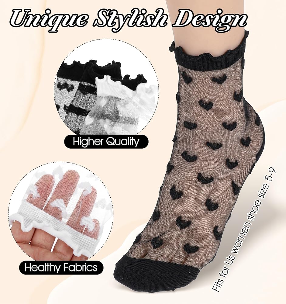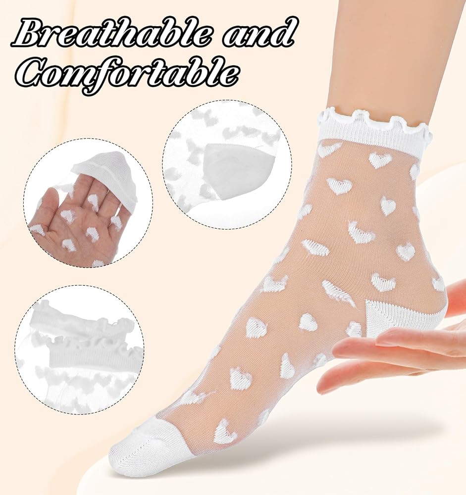 جوارب شفافة أنيقة - تتميز الجوارب النسائية المصنوعة من الدانتيل بأنماط شفافة مرحة مع فتحات مكشكشة رقيقة، مما يخلق مظهرًا أنيقًا مثاليًا للارتداء مع جوارب الكاحل الشفافة والصنادل الصيفية.