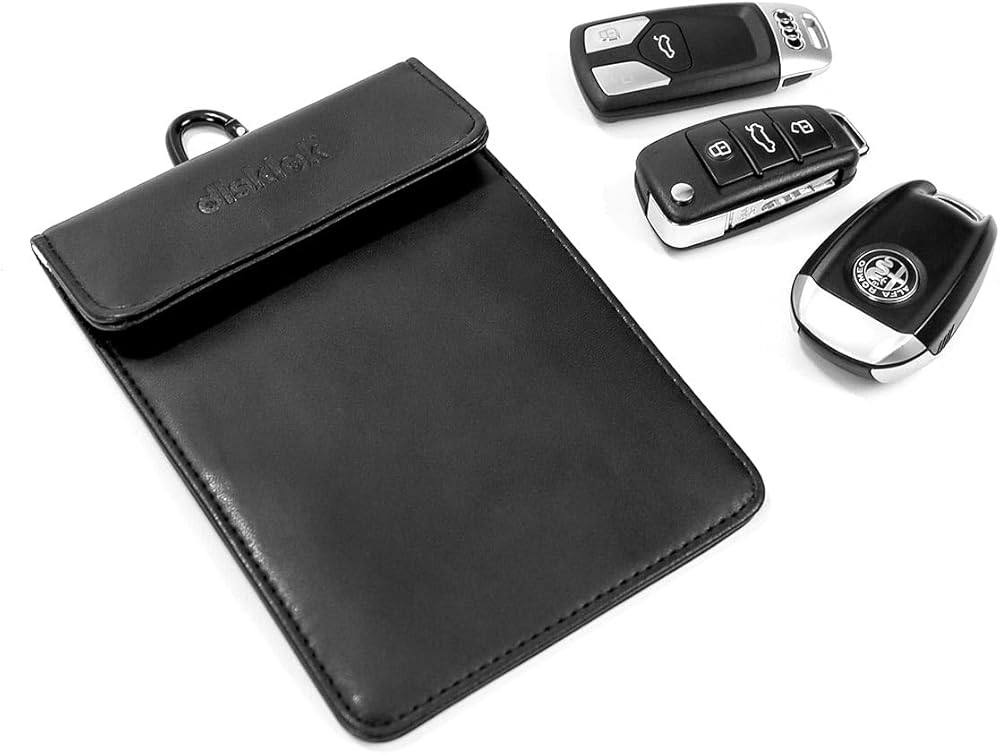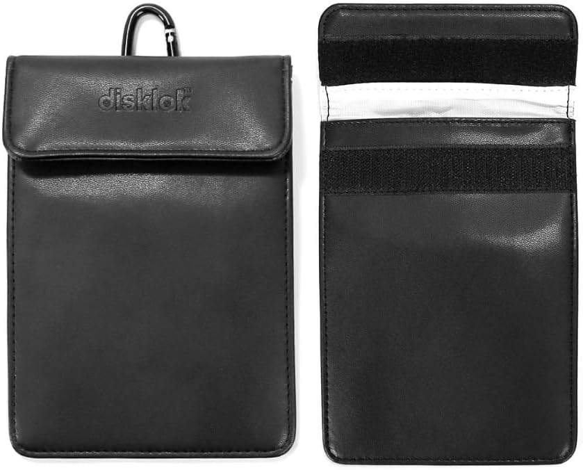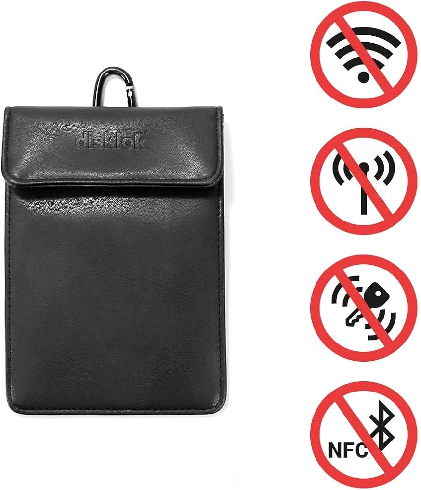 STAY SAFE AND BLOCK ALL FREQUENCIES - The Disklok RFID pouch works by using the signal blocking Faraday shield lining: This lining prevents all electromagnetic influences such as RFID, NFC, Bluetooth, GPS/Sat Nav networks, 2,3,4 & 5G and WIFI from sending or receiving signal