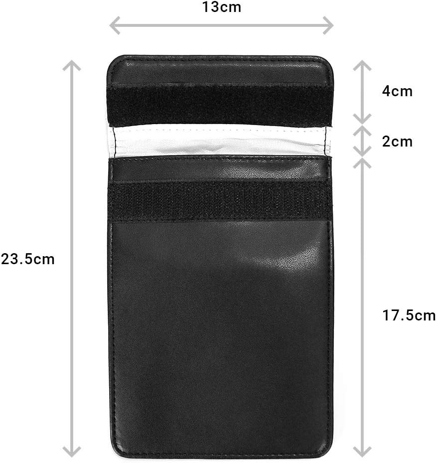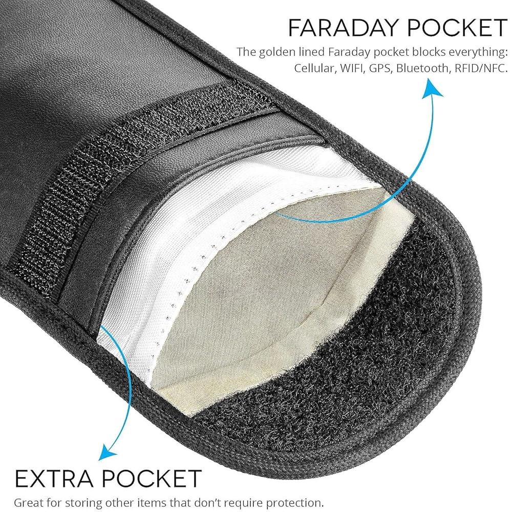 DURABLE FAUX LEATHER DESIGN - The pouch comes with 2 inner pockets: one with the essential faraday lining for protection and another for general storage. The secure hook and loop fastening is easy to use, the PU leather is completely waterproof and the pouch features a handy carabiner clip for extra assurance.
