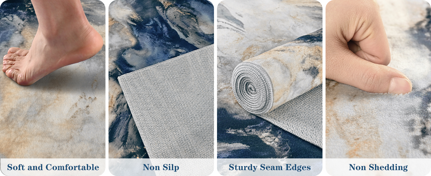 كومة منخفضة: يبلغ سمك السجادة الرخامية الزرقاء والذهبية مقاس 5x7 0.25 بوصة فقط. سواء عند الباب أو تحت طاولة الأريكة والكراسي، لن يكون هناك أي إحساس بجسم غريب. لن يزعجك انسداد الباب، مما يسمح لك بالاستمتاع باللحظة الحالية بسهولة