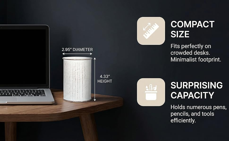 • حجم صغير مثالي: يبلغ قياسه تقريبًا 2.95 بوصة × 4.33 بوصة (عمق × ارتفاع)، يسمح التصميم الموفر للمساحة لحامل القلم المعدني هذا بالاندماج بسلاسة في مساحات المنزل والمكتب والمناسبات. على الرغم من حجمها الصغير، إلا أنها واسعة بشكل مدهش، وقادرة على حمل العديد من الأقلام والقشات وفرش المكياج وأدوات المائدة وباقات الزهور والمزيد.