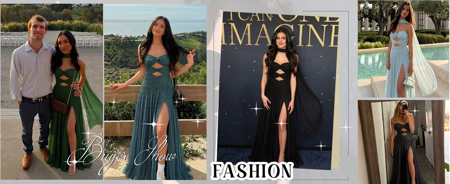 القماش: هذا الفستان الرسمي الطويل مصنوع من قماش التول، وهو فخم وكثيف وذو بنية ناعمة، مع عمق رقيق يميزه عن الأقمشة العادية. ويحول الشيفون فستانًا بسيطًا إلى بيان من الرقي الخالد