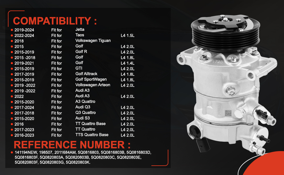 الإعداد: ضاغط مكيف الهواء متوافق مع Audi A3 2015-2020، لـ A3 2022 L4 2.0L، لـ A3 Quattro 2015-2020، لـ Q3 2017-2024 L4 2.0L، لـ Q3 Quattro 2017-2018 L4 2.0L، لـ S3 2015-2020 L4 2.0L، لقاعدة TT Quattro 2016 L4 2.0L، لـ TT Quattro 2017-2023 L4 2.0L، لقاعدة TTS Quattro 2016-2023 L4 2.0L