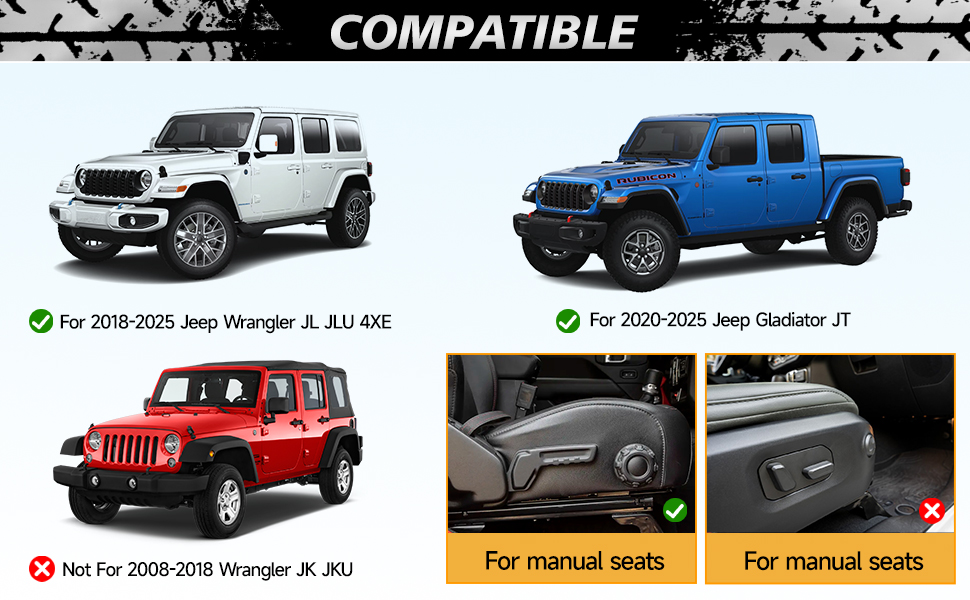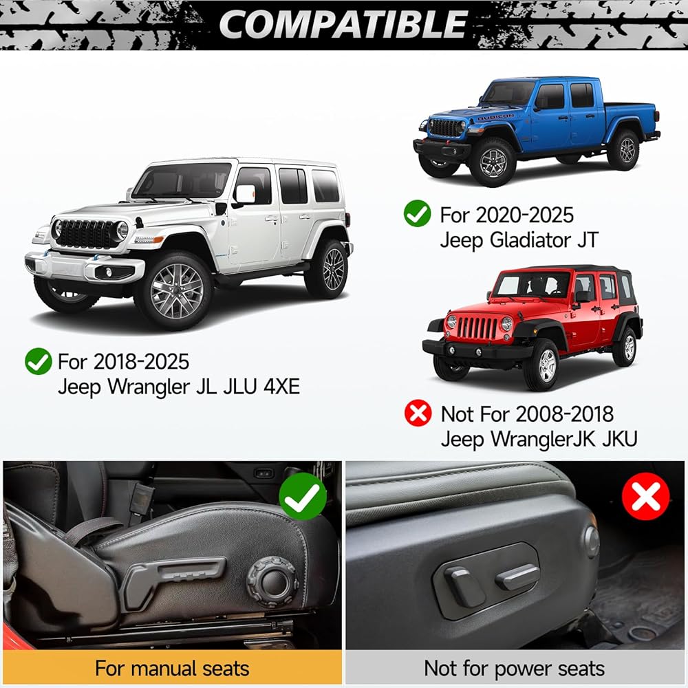 ملائم: مصمم خصيصًا لباب 2018-2025 Jeep Wrangler JL/JLU/4XE و2020-2025 Jeep Gladiator JT 2/4. يرجى ملاحظة: ليس لـ JK/JKU، أو المقاعد الكهربائية أو الأبواب الخلفية