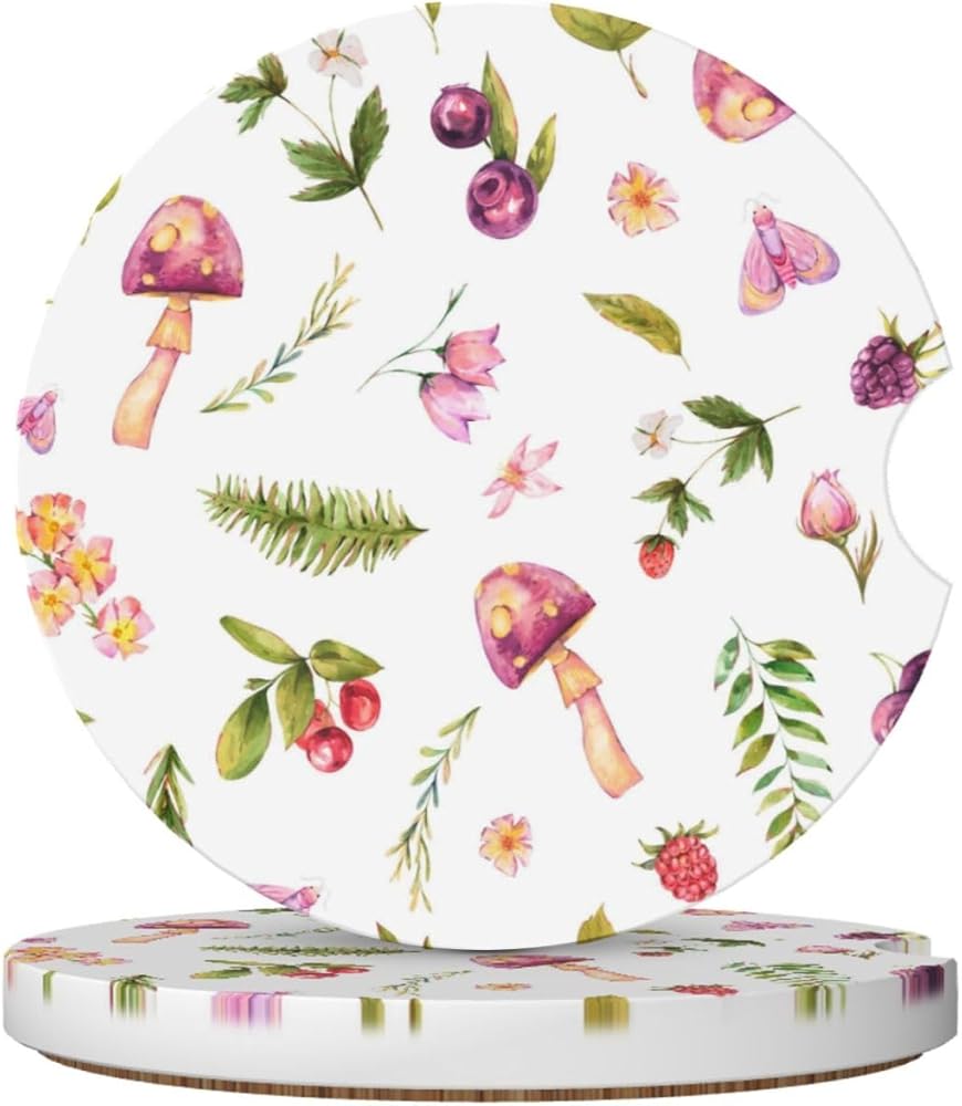 Woodland Flowers Berries 2 Pack Car Cup Holder Coasters Absorbent Ceramic Drink Coasters 2.56" Universal Anti Slip Cup Mat with Cork Base Finger Notch Auto Accessories Interior for Women Men