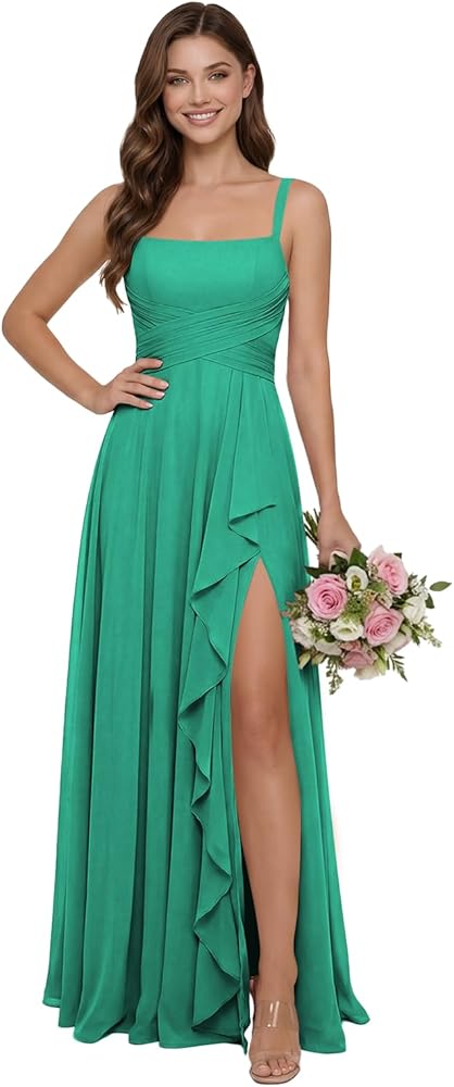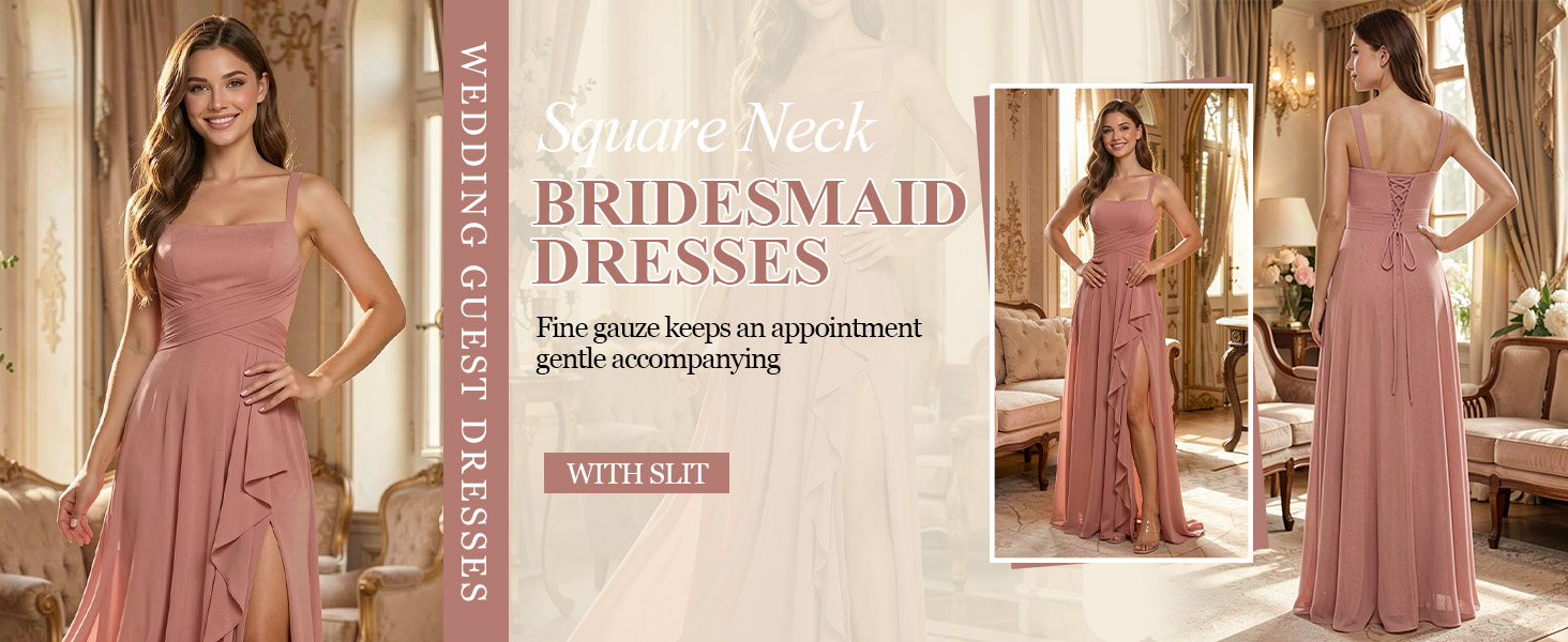 المزايا: هذا الفستان الرسمي ذو خط رقبة مربعة وكشكشة، مكشكش، ورباط من الخلف، وأشرطة سباغيتي، وفتحة، وطول يصل إلى الأرض، وحمالة صدر مدمجة