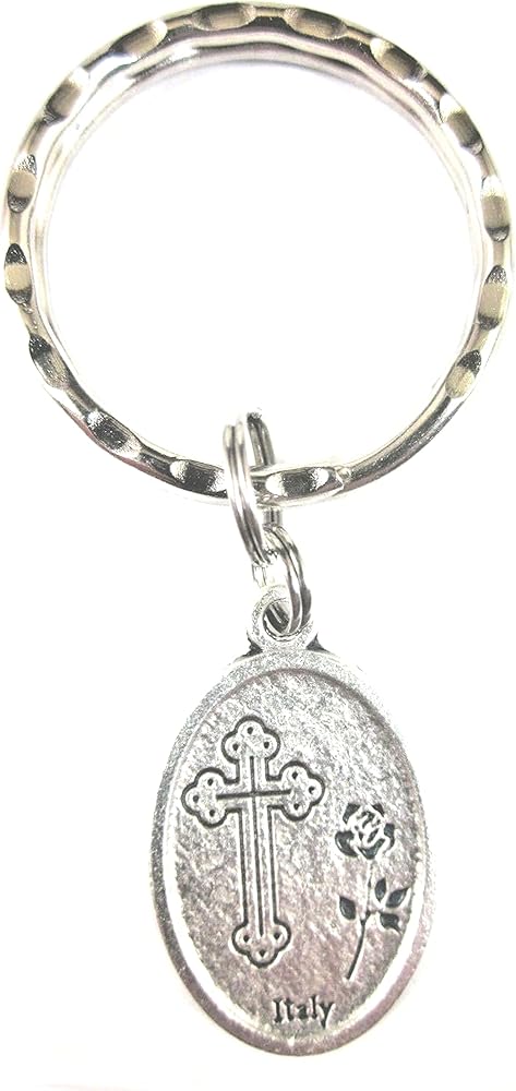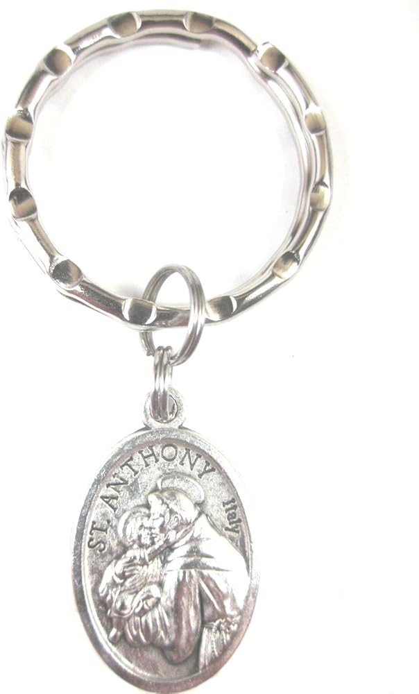 1" oxidized medal on a 1" hammered key ring. Patron of Travelers, Sailors, Fishermen, Lost Articles, Expectant Mothers, Elderly People, Oppressed People, The Poor, Animals. St Anthony prayer card included, image from card shown.