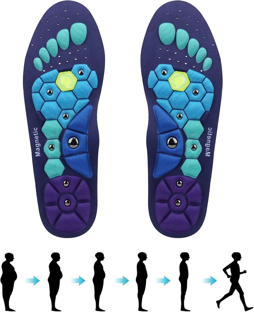 عمل مزدوج: تتميز النعال الداخلية الداعمة للقوس بتعزيز القوس المستهدف لتوزيع الضغط بشكل فعال تحت القدم. يعمل ضبان الوخز بالإبر لفقدان الوزن على تحفيز نقاط انعكاس القدم بذكاء، وتعزيز الدورة الدموية وتخفيف نتوءات الكعب، وآلام القوس، والتعب الناتج عن الوقوف أو المشي طوال اليوم.