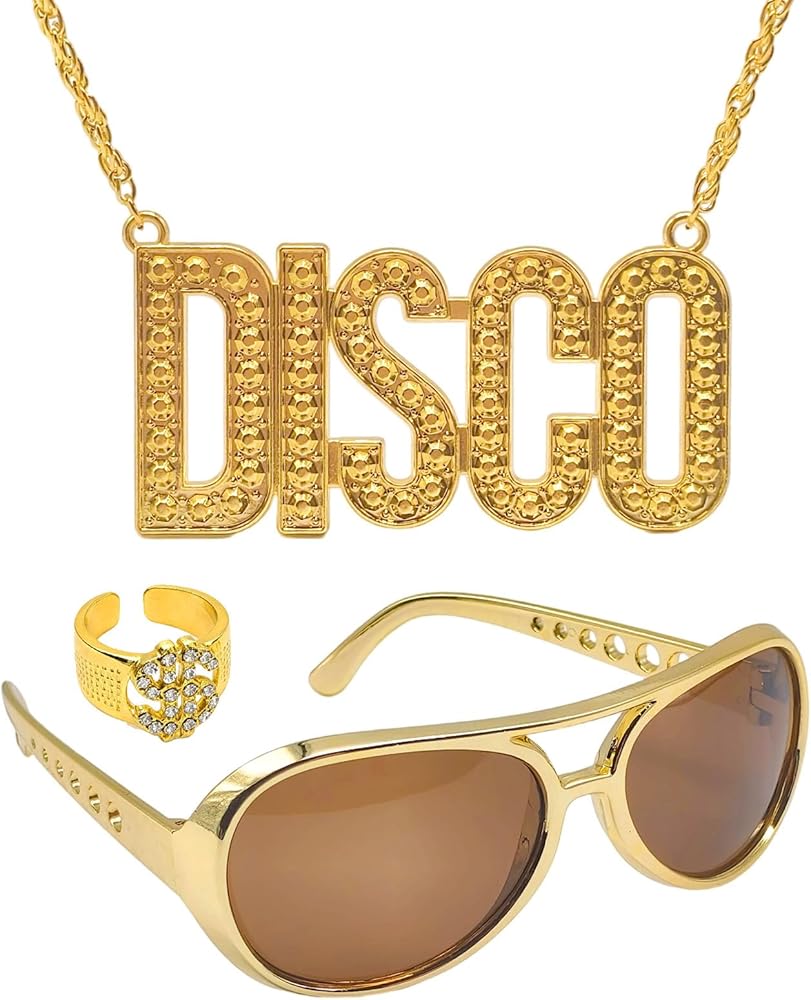 1. This 70s costume set includes a retro-chic disco necklace, a dollar sign ring, and gold sunglasses.