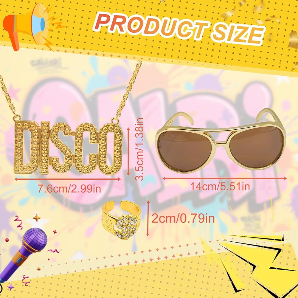 • 【One Size Fit All】Disco chain necklace circumference: 70 cm, disco pendant size is 7.6 x 3.5 cm; disco sunglasses: 14 x 13 cm, our disco party set is suitable for most men and women. Please confirm the size before purchasing.