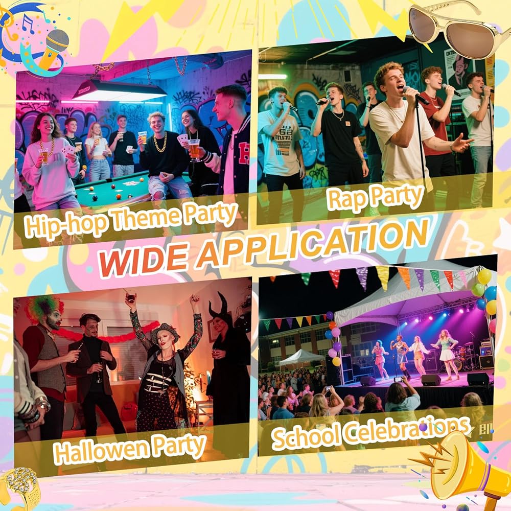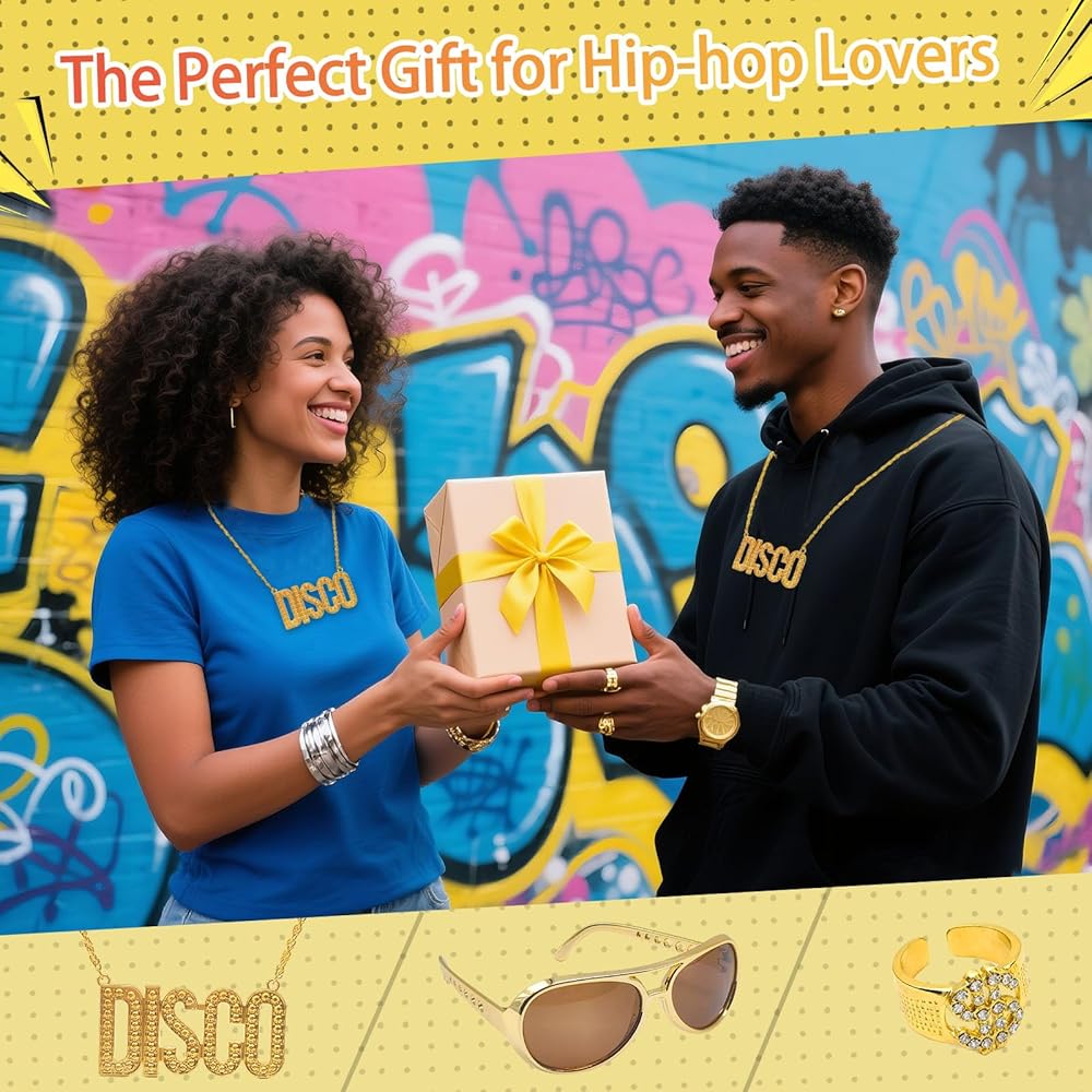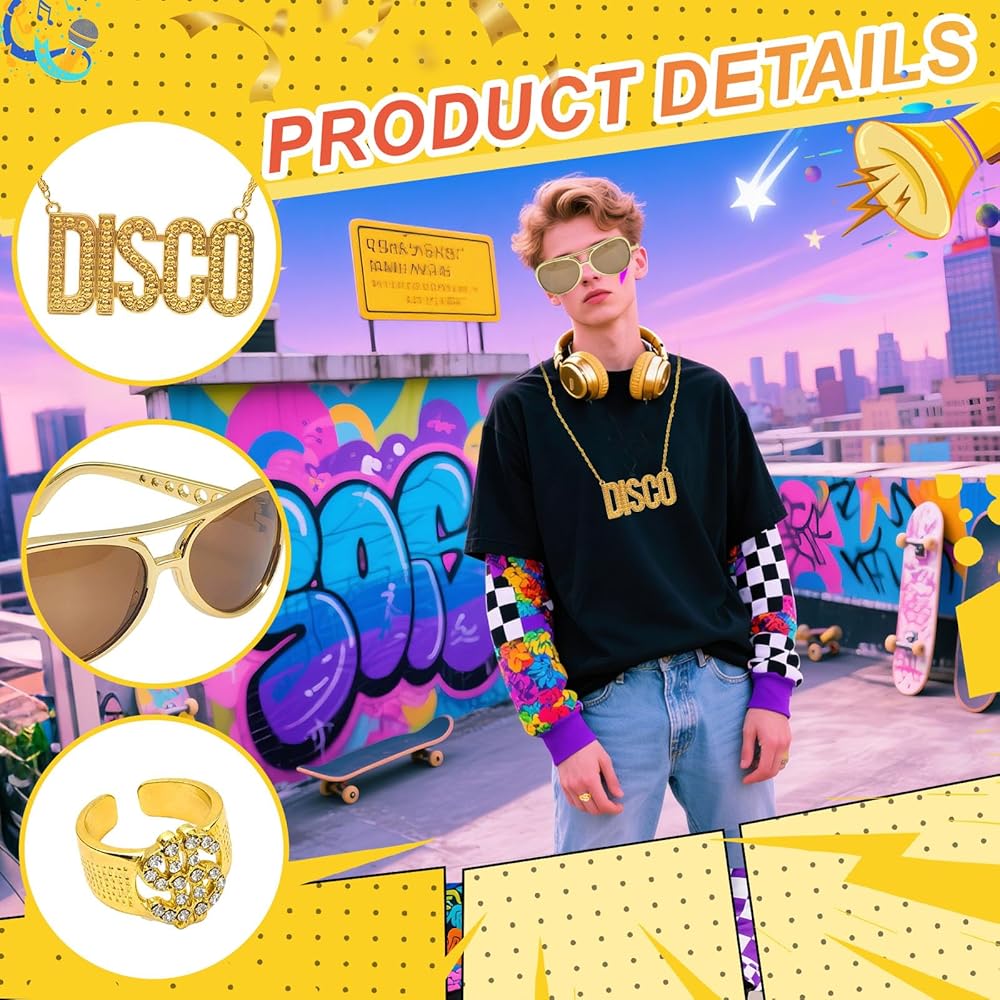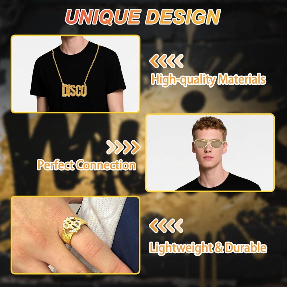 • 【Highquality Material】Disco gold chain necklace and dollar sign ring are made of high-quality alloy, and gold fashion glasses are made of high-quality plastic and metal, which are fashionable and versatile, durable and not easy to fade.