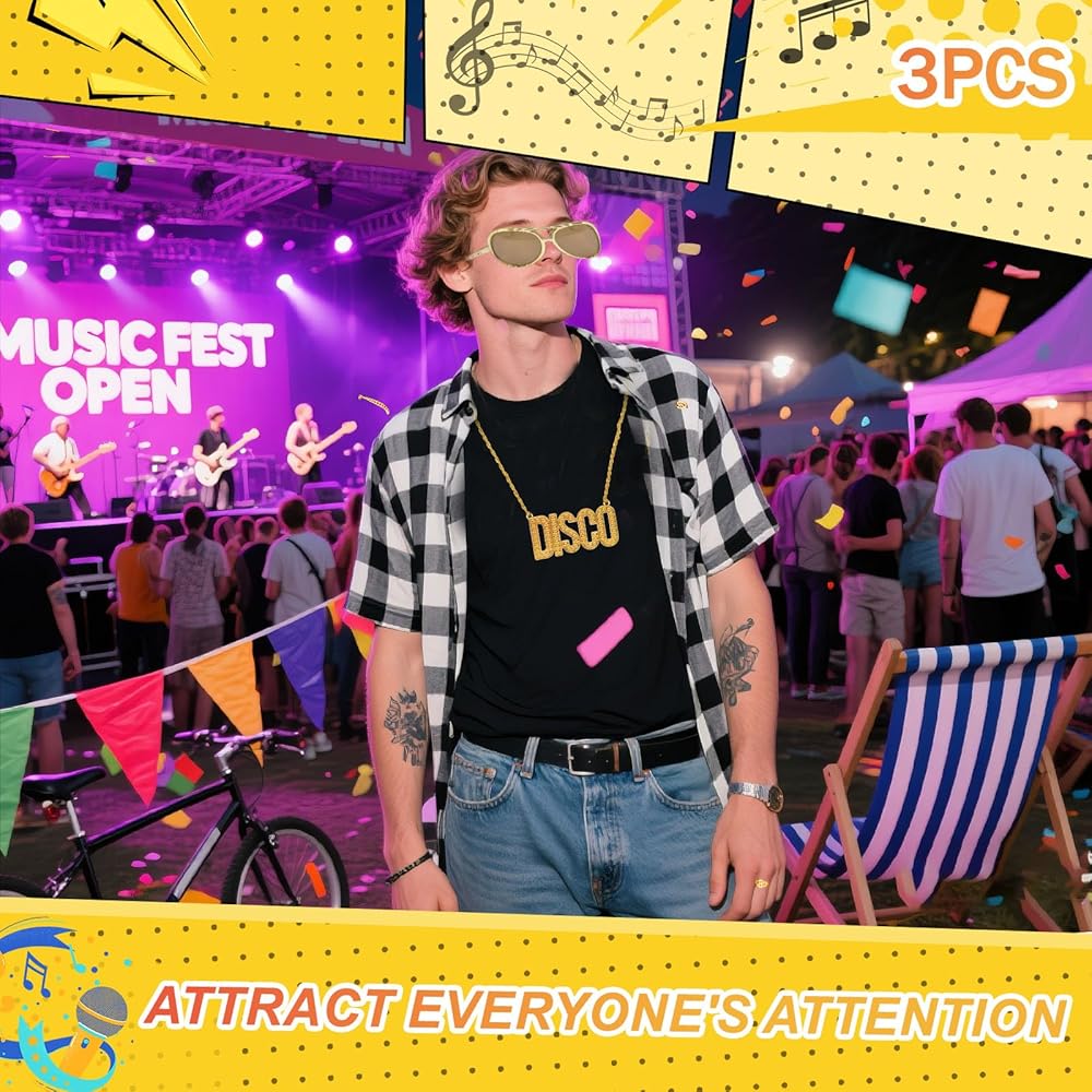 • 【Package Included】60s 70s accessories for men and women, including 1 disco necklace + 1 pair of metal fashion glasses + 1 dollar sign ring, perfect for hip-hop parties and costume accessories, will add 70s glamour to your outfit.