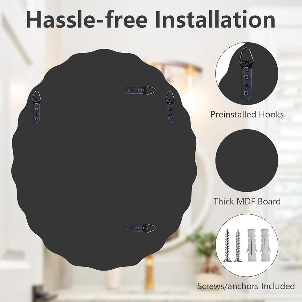【Easy Installation】All mounting hardware are included. The thick MDF backboard is sturdy enough to support the weight of this oval bathroom mirror, with 4 pre-installed hooks on it, you can easily complete the installation within minutes. Support for both horizontal and vertical hanging.