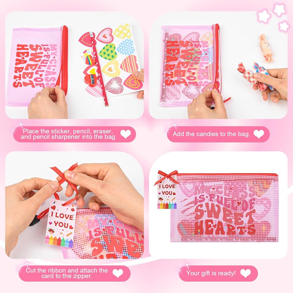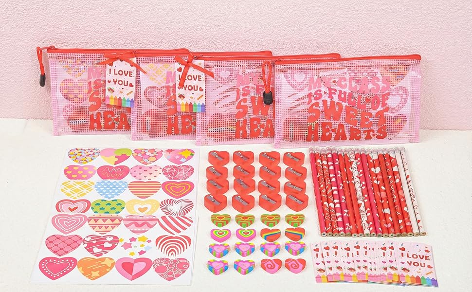 هدايا عيد الحب للأطفال: مجموعة من 24 حقيبة هدايا مدرسية لعيد الحب تتضمن 24 كيسًا جميلًا بسحاب، و24 قلم رصاص، و24 ممحاة، و24 مبراة أقلام رصاص، و24 عبوة من الملصقات. كل ما تحتاجه للحصول على هدايا عيد الحب الممتعة والمثيرة لفصول الأطفال!